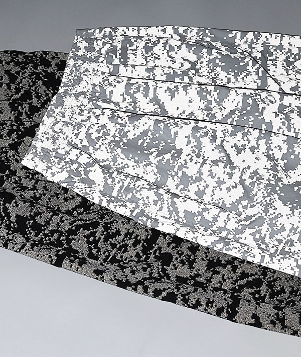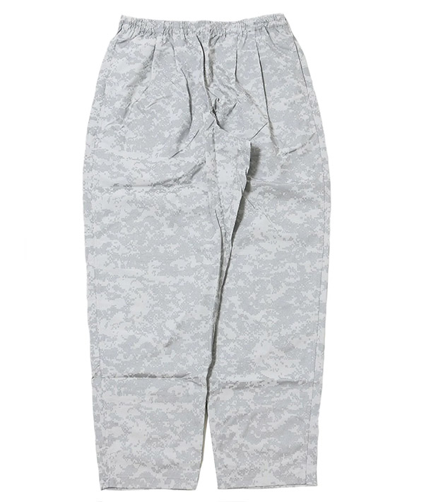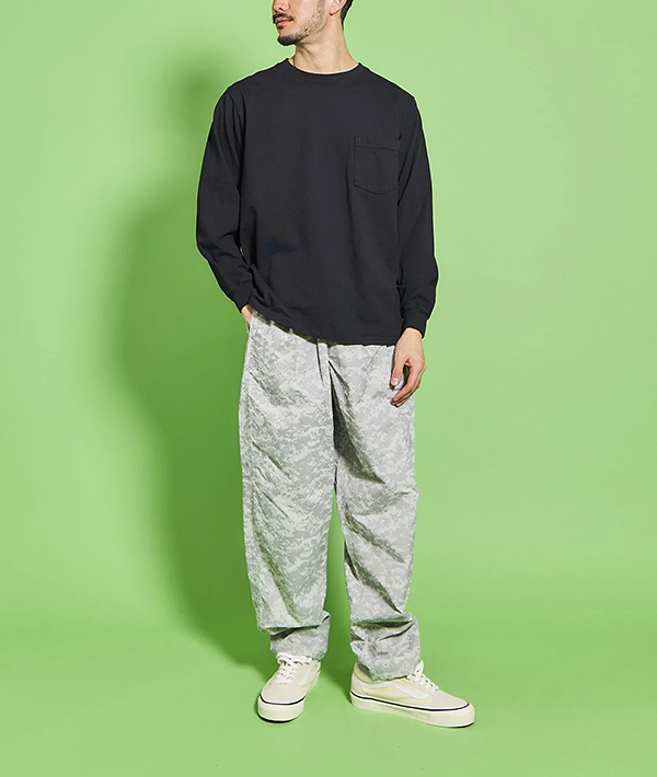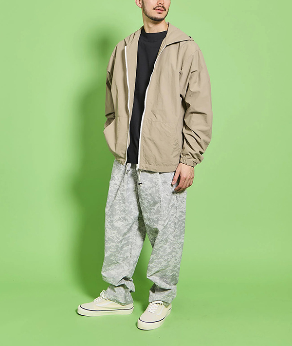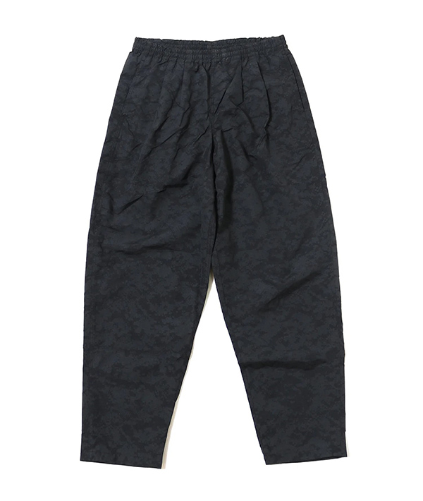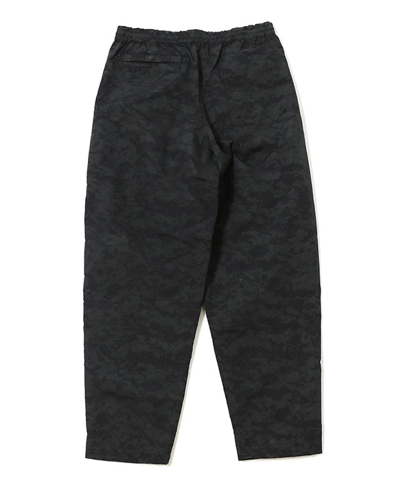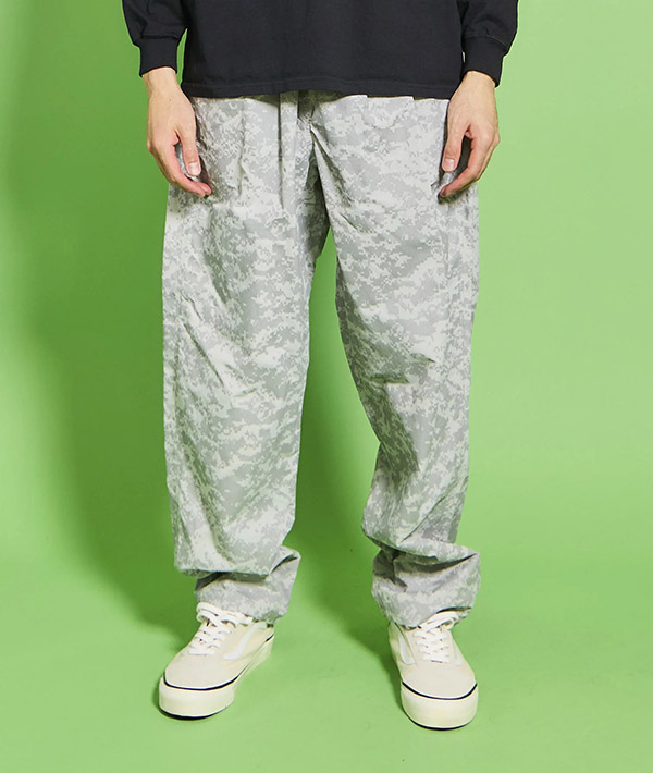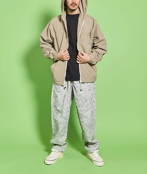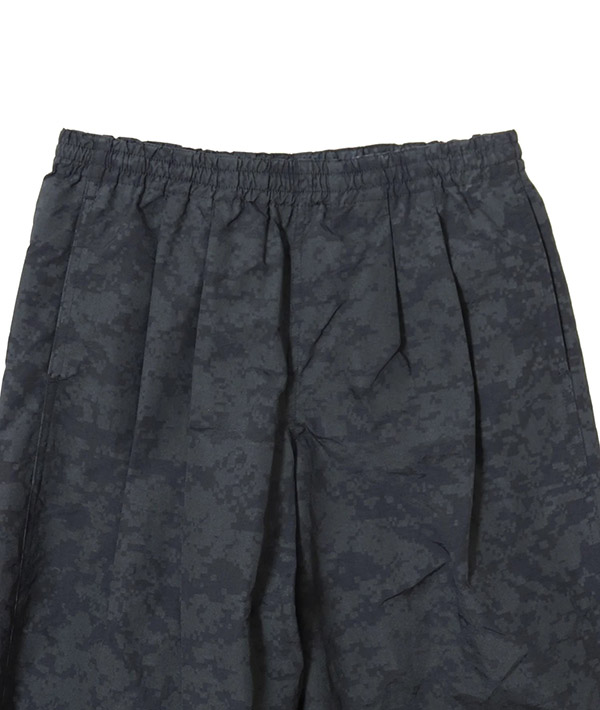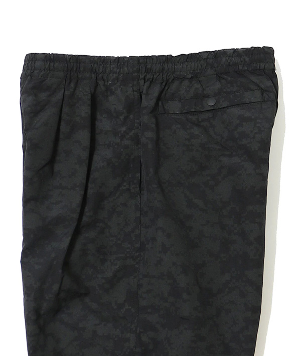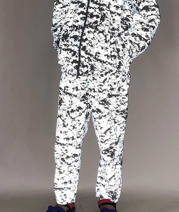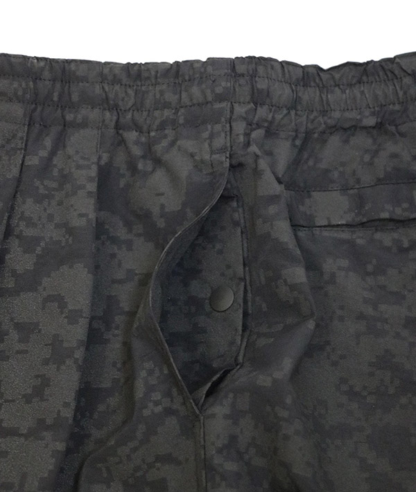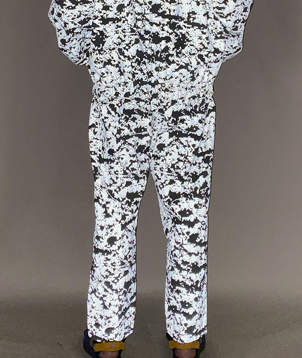 速乾性、UVカット機能に優れた高機能ナイロン素材 SUPPLEX NYLON にデジタルカモのリフレクタープリント加工をおこなったトラックパンツ。黒地に濃色のリフレクタープリントとグレー地に明るいシルバーのプリントを施した2色展開。暗くなってからの外出時に光を強力に反射するので視認性は抜群です。ハンドポケット、バックヒップの部分にそれぞれ左右に2つずつポケットが配備されています。左手側のハンドポケット部分は上下で二層になった仕様に。小物の小分けに便利です。ウエストはエラスティックゴムとドローコードで、フィッティング調節も簡単に行えます。スポーツにも最適です。・速乾性、UVカットに優れたSUPPLEXナイロンシェル。