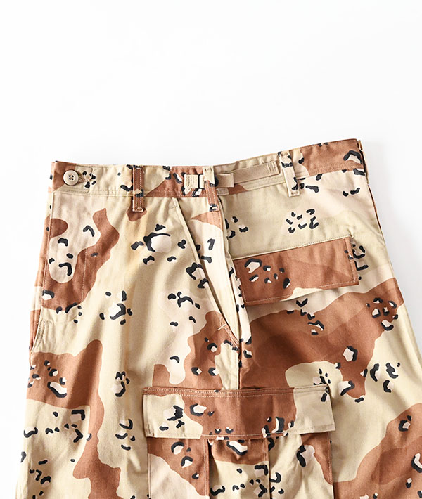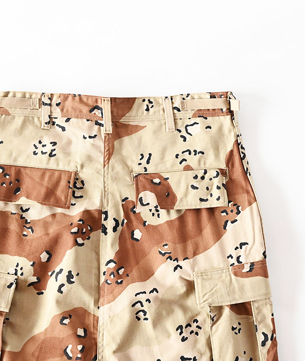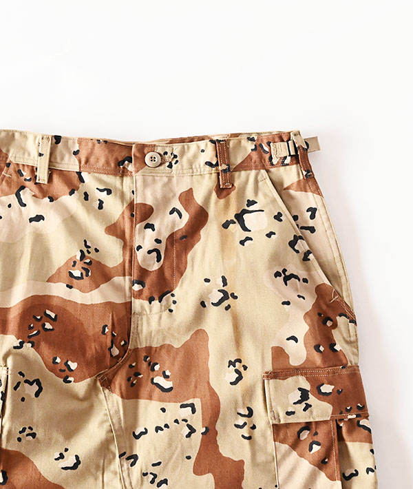US Militaryのデッドストック 6 COLOR DESERT CAMOUFLAGE BDU PANTSをリメイクしたロングスカート。80年代初頭から90年代中頃まで採用されたこちらの迷彩 ”6 COLOR DESERT CAMOUFLAGE” は 通称 “CHOCOLATE CHIP” と呼ばれており、アメリカ人が大好きなチョコチップクッキーのような模様が入る6カラーのデザートカモフラージュパターンになります。ウエスト部分に施されたアジャスターによりサイズ調整が可能です。