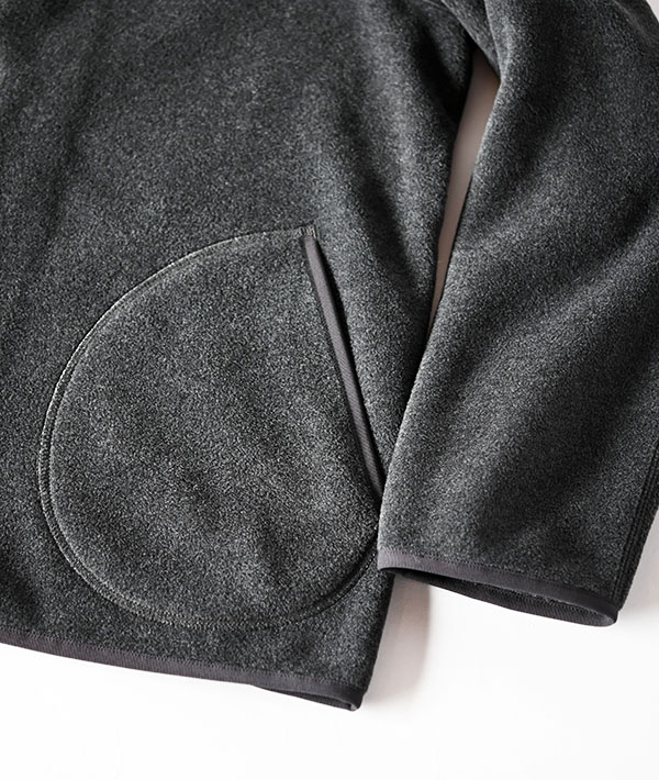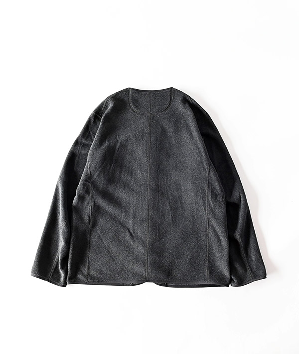 カバーオールをデザインベースにしたノーカラーのフリースジャケット。レーヨンが混紡された両面起毛のフリースは、他にはない柔らかさとメランジ感が特徴。保温性と伸縮性が高く、ふっくらとした軽やかな着心地の良さです。フロントはスナップボタン仕様で、秋はカーディガンのように気軽に羽織れ、真冬はアウターの中に着込んでミドルレイヤーとしても活躍します。