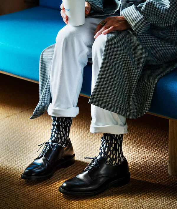 旧東ドイツ軍やチェコ軍などで採用された通称 「レインドロップカモ」 は、そのパターンが雨降りのように見えることから名付けられたユニークな迷彩柄。「RAIN DROP CREW SOCKS」は、そんなカモフラージュ柄をローゲージ編み機で現代的に再現。ざっくりとしたニットの 表情を大切にし、カジュアルな装いはもちろん、モードなスタイリングにも似合うよう仕上げています。