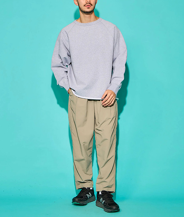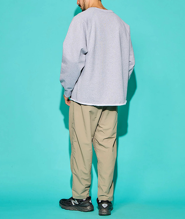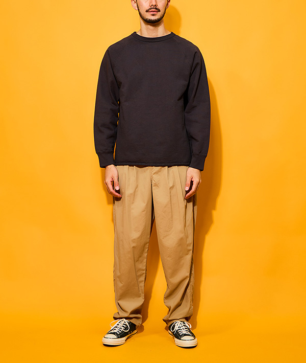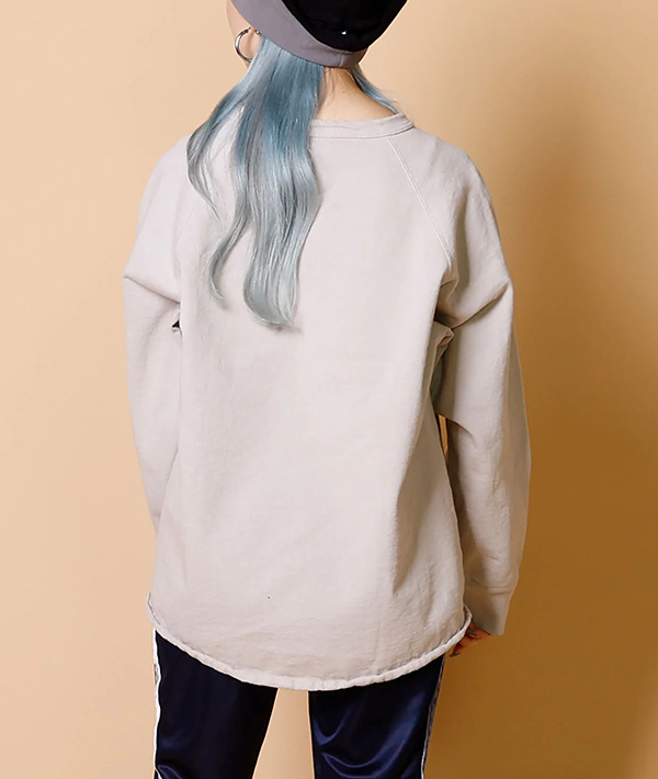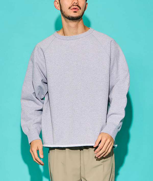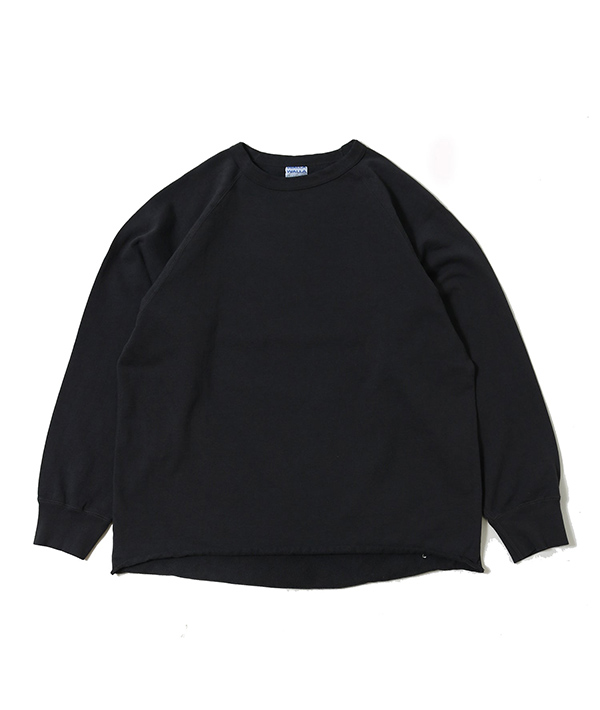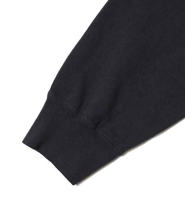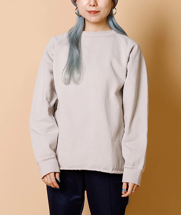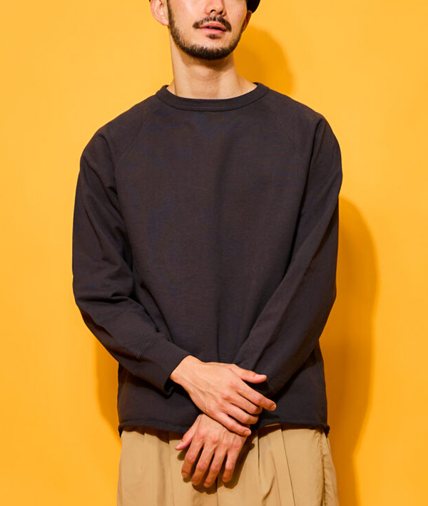13オンスの米綿のスウェット生地を後染めしたクルーネックスウェットです。裾は切りっぱなしになり、リブがついていないのでチョウチンシルエットでなくL/S TEEのようなストンとしたシルエットになります。ラフにざっくりと着られ、厚手のスウェット生地なので冬のインナーとしても活躍してくれます。