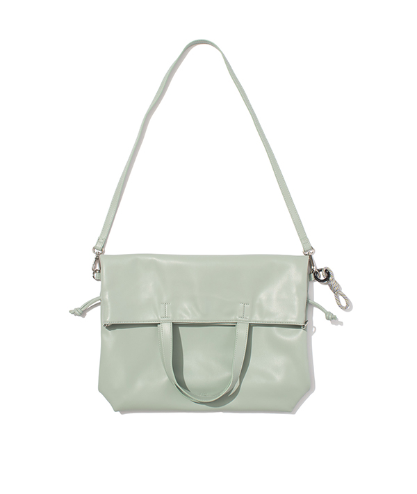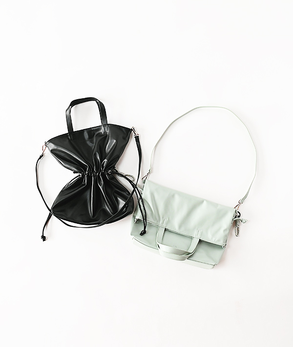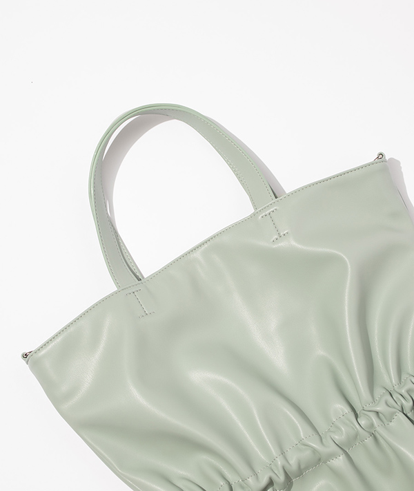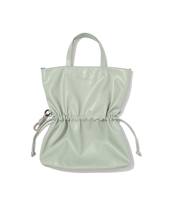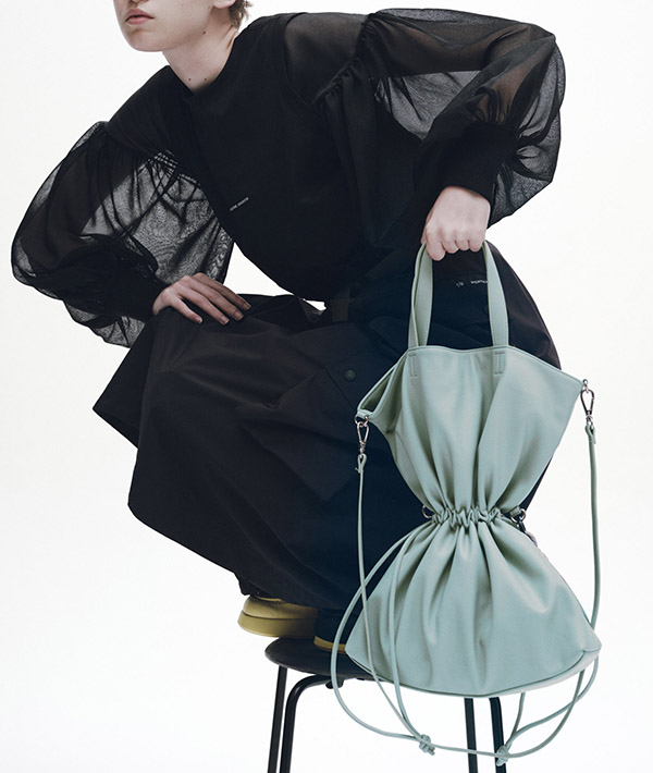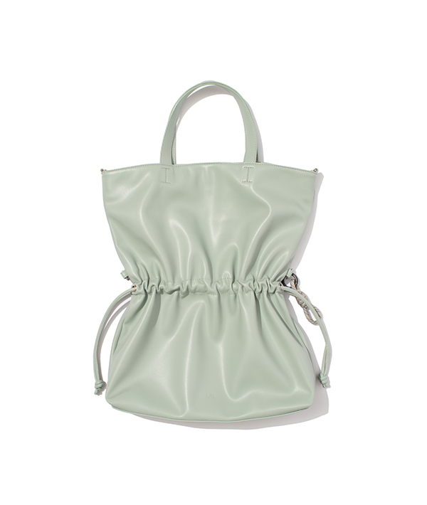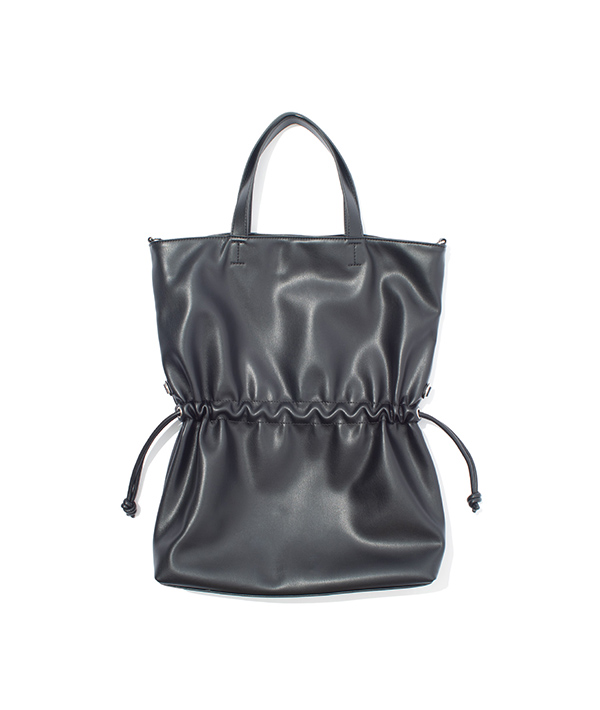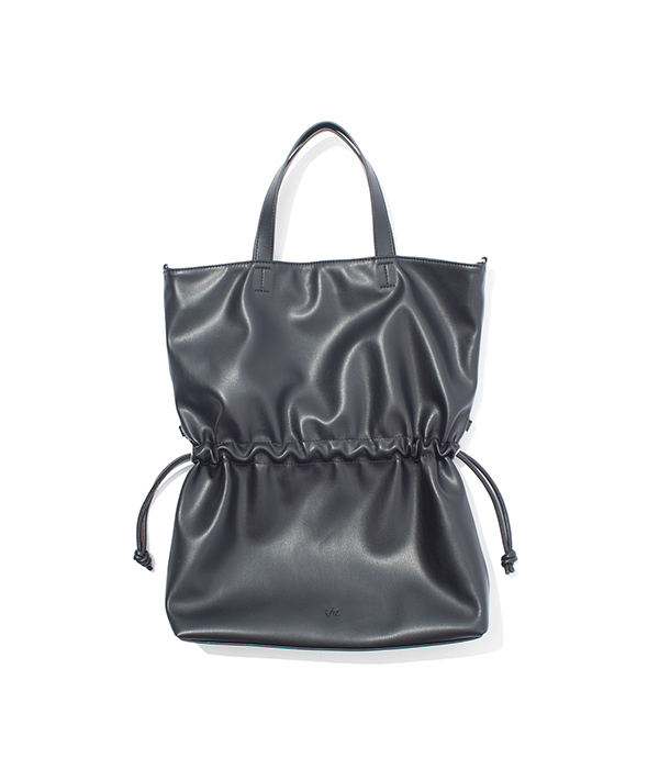 100%アニマルフリーのエコテックレザーを使用した、2wayショルダートートバッグ。このエコテックレザーは、柔らかくて軽く、汚れにくいというハイブリッドな素材で、モダンな印象に仕上がることが特徴的です。ハンドでもショルダーで使用可能な2way仕様で中に入れる荷物の容量により、紐を絞ることで表情を変えられるのもポイント。エコテックレザーの柔らかさから成るドレープ感が特徴です。 デイリーに使いやすいサイズ感が便利。フラップはマグネットボタンで止めることができ、付属のロープアクセサリーもポイントです。