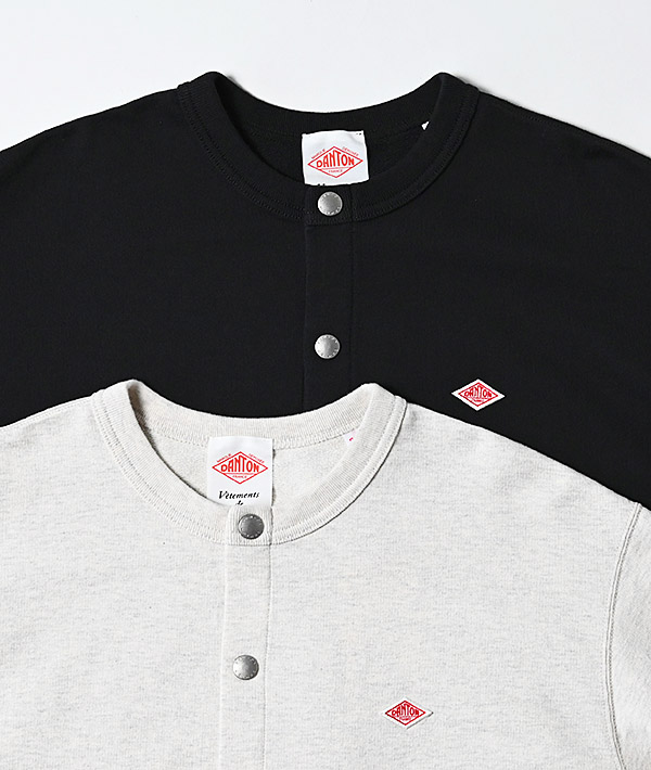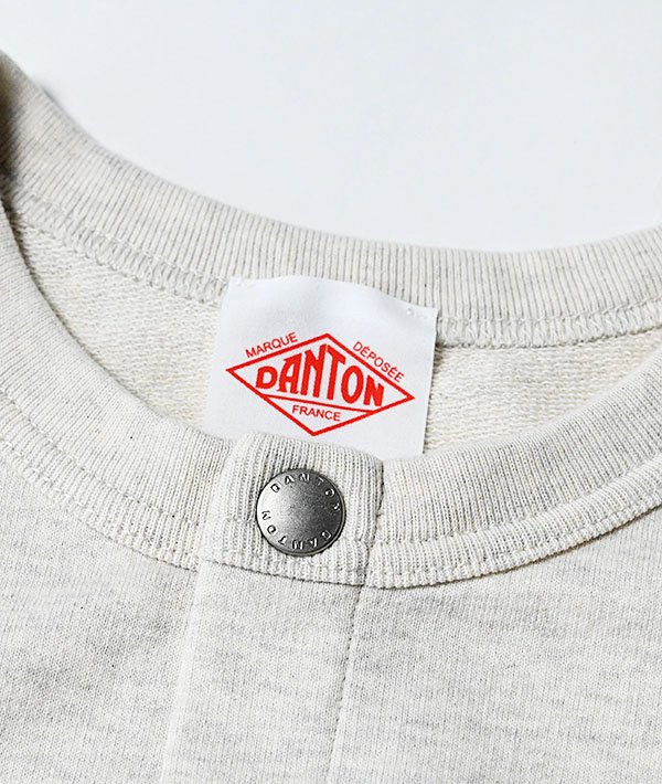 綿100%のコットンテリーを使用したスウェットカーディガン。旧式の編機でしっかりと編み上げることで適度なハリをもたせた度詰めのインレイ素材。インレイ編みは、厚みを抑えながらも伸びの少ないしっかりとした生地感が特徴です。やや大きめにとったネックライン、短い着丈、ワイドなボックスシルエットに仕上げられており、「DANTON」の刻印入りドットボタンがアクセントになっています。
