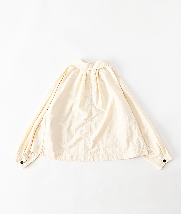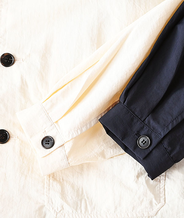 コットンのようなナチュラルな風合いが特徴のナイロンタッサー素材を使用したカバーオールタイプのショートコート。季節の端境期にも着用しやすい程よい厚みの生地を採用。バックギャザーやドルマンスリーブ、Aラインシルエットなどモダンなデザインが特徴。裏地のない一枚仕立てで軽やかな着用感です。