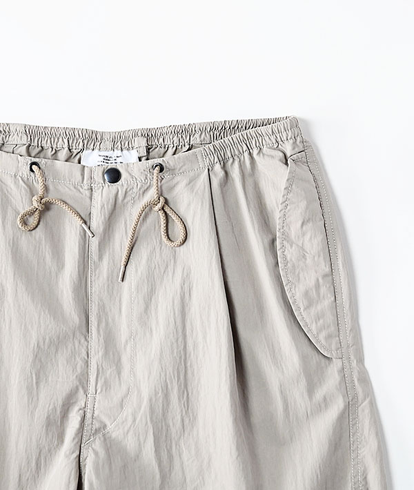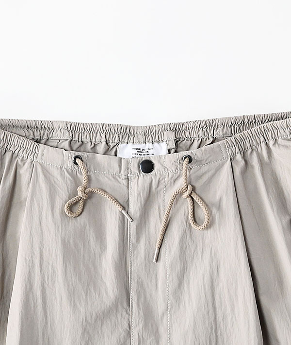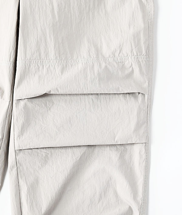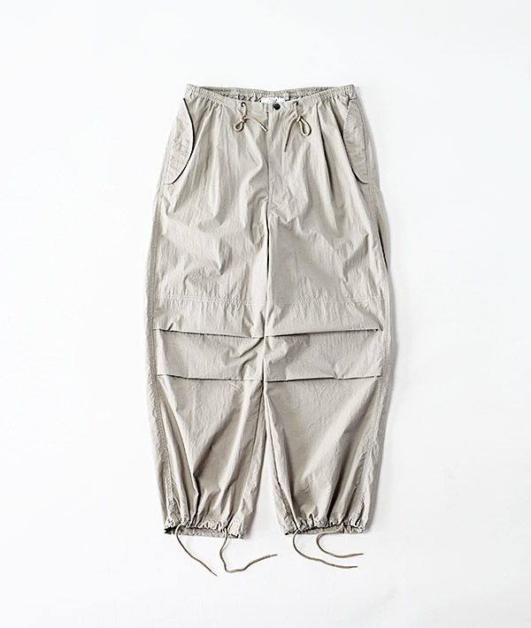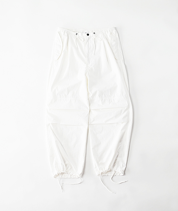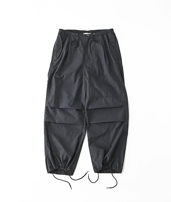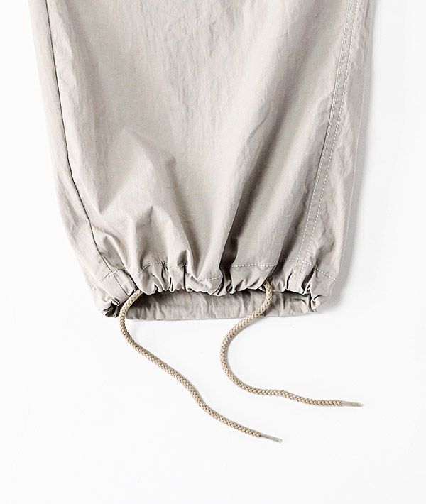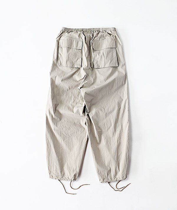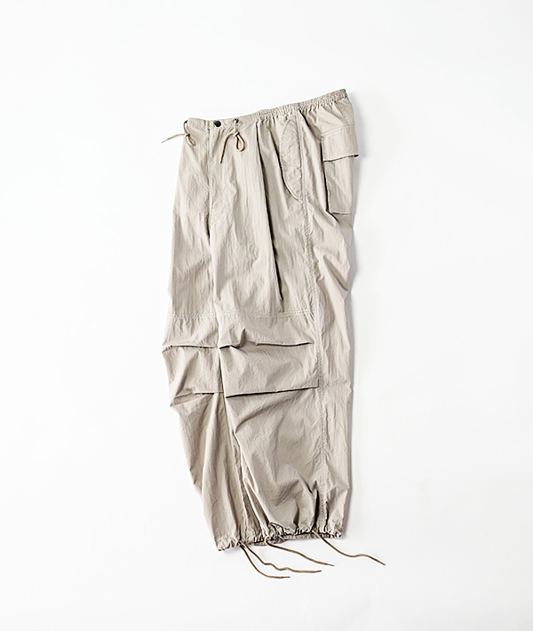 アメリカ軍の寒冷地用M-51オーバーパンツを軽やかにアレンジ。しっかりと高密度に織られたコットンナイロンにウェザー製品洗いでワッシャー感あるテクスチャーに仕上げています。春夏秋とスリーシーズン対応する使いやすさと上品さがプラスされた印象です。ウエストは平ゴムとスピンドルで楽に穿けるイージー仕様。シルエットは膝のアクションプリーツによる立体的なオーバーシルエット。裾はオリジナルと同様にスピンドルで絞れる仕様となっています。