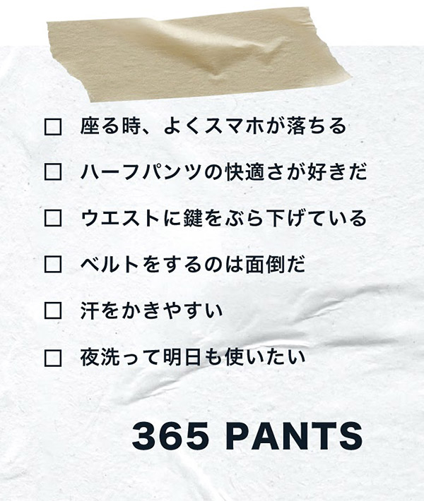 365パンツは、その名の通り1年365日の着用を想定した、短パンとしても使えるテックパンツです。