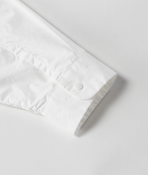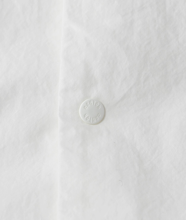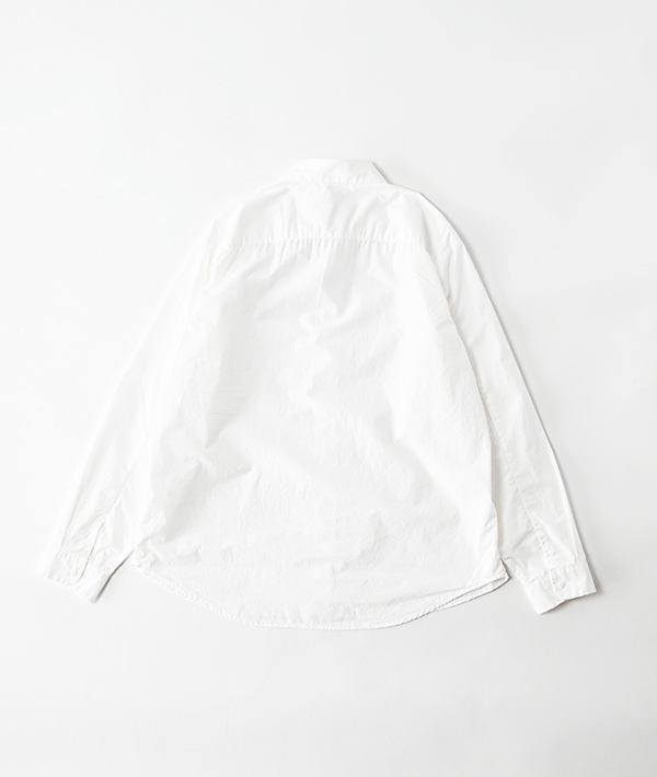 細番手のコーマ糸を用いて、高密度で織り上げたタイプライター素材を使用。インターロック縫製で糸調子を調整してパッカリングを出したデザインのシャツとなります。表からは飾りステッチがほとんど見えず、シンプルながらウォッシュ感とパッカリングでシワ感ある表情を醸し出しています。着脱しやすいドットボタンを採用。