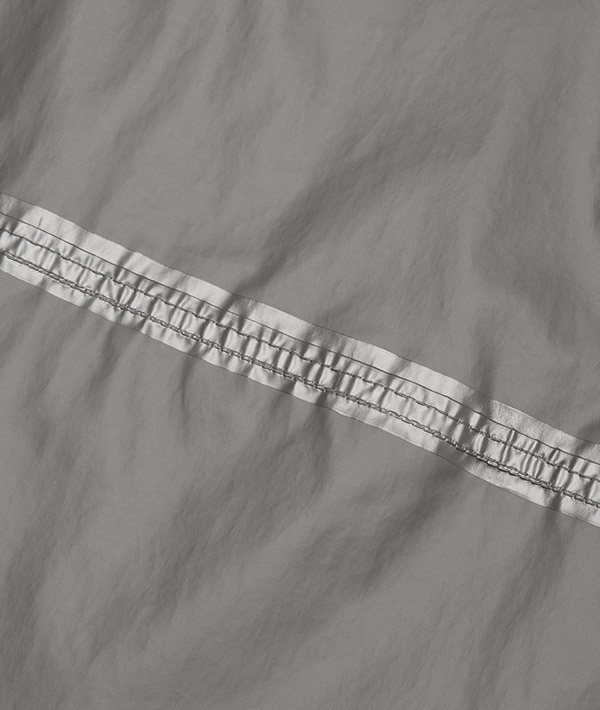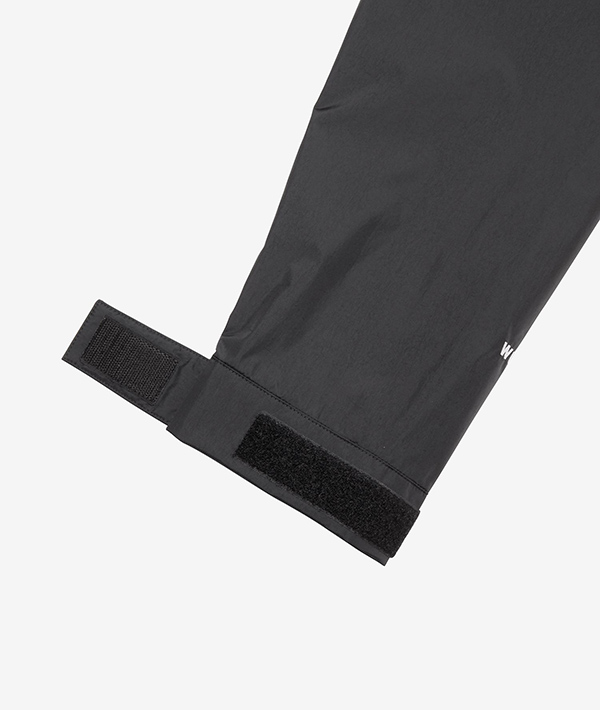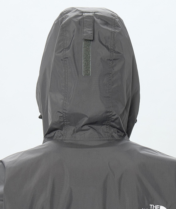 50デニールの薄くしなやかなナイロン素材に、耐久性があり、原料リサイクルが可能なWUROSを採用。加水分解しにくい防水膜とシームテープを使用することで生地の耐久性を強化。両サイドのジッパーポケットとフロントのカンガルーポケットはいずれもフラップ付き。カンガルーポケットに本体を収納できるポケッタブル仕様で、ランヤードなどを取り付けて携行することも可能です。裾はドローコードでフィット感の調節ができます。重ね着がしやすいゆとりのあるシルエットに仕上げ、気温や天候の激しい変化に対応するアイテムです。