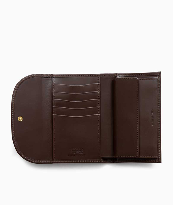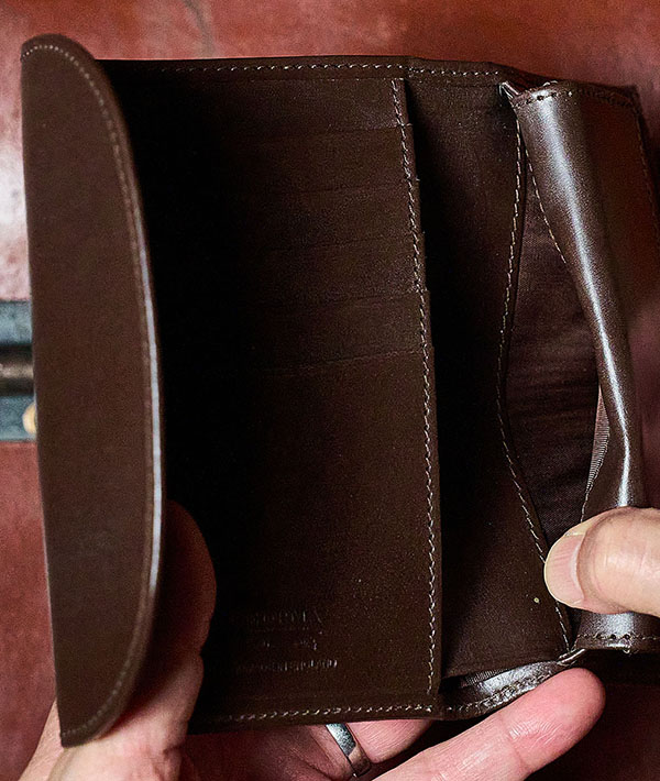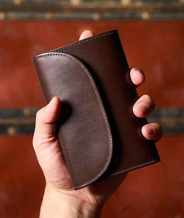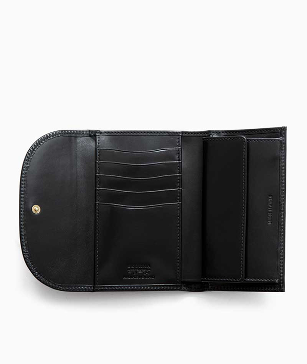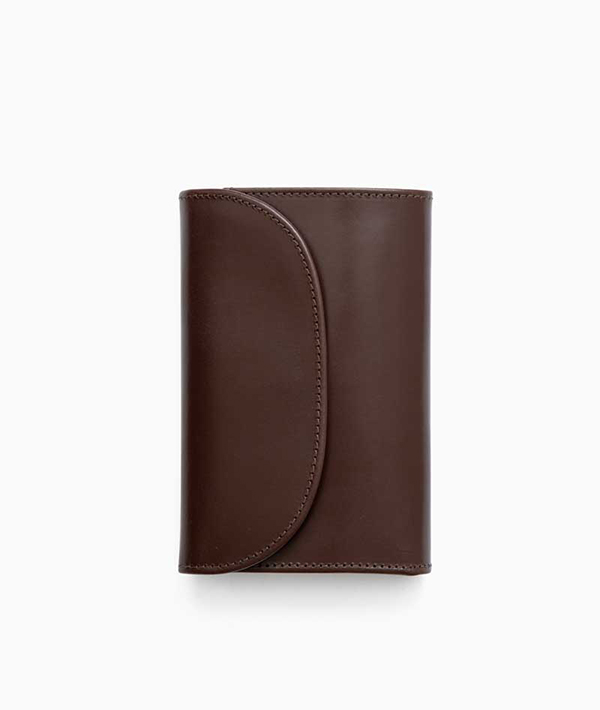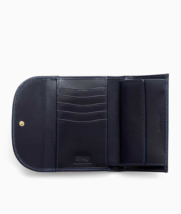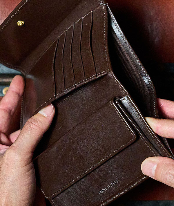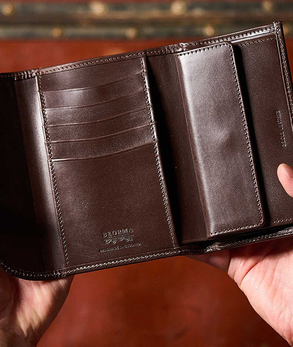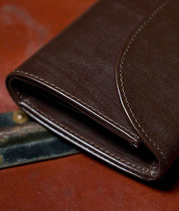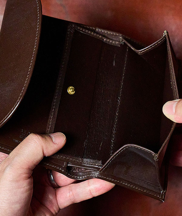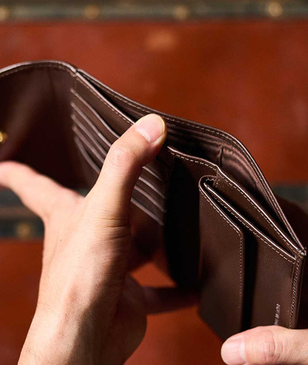 ユニセックスで使用できるラウンディッシュなフォルムが魅力なS7660三つ折りウォレット。札入れと大型のコインケースの他に5室のカードポケットと3室のマルチポケットを備えており、抜群の収容力を誇ります。使い始めこそ堅いイングリッシュブライドルレザーは、使うほどに次第に手に馴染み、経年変化によって味わいと美しさが増します。