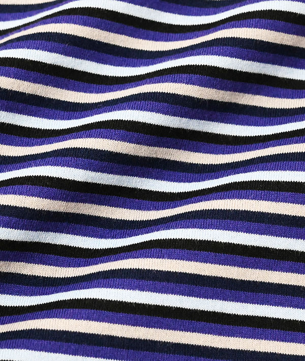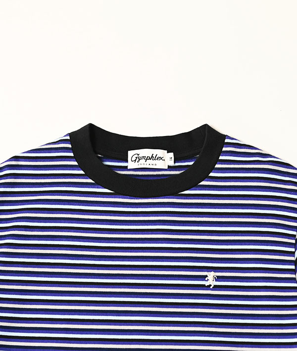 多色のマルチストライプが目を引く Gymphlexオリジナル柄のマルチボーダーTシャツ。ややタイトなシルエットとネックの詰まり具合や肩傾斜のバランスにこだわったTシャツです。通常工程で入るシルケット加工をなくし、製品で洗いをかけることでよりナチュラルな雰囲気に仕上げています。