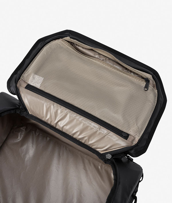 メイン素材に耐水性と耐久性をもつ300デニールのリサイクルポリエステル(TPEラミネート)を採用し、ボトム素材にはタフな420デニールのリサイクルナイロンを配置。持ち運びに便利なグラブハンドルをサイド4面に備え、ウィーラーハンドルに通せるテープ付きで、スタイルに合わせてスムーズに移動できます。