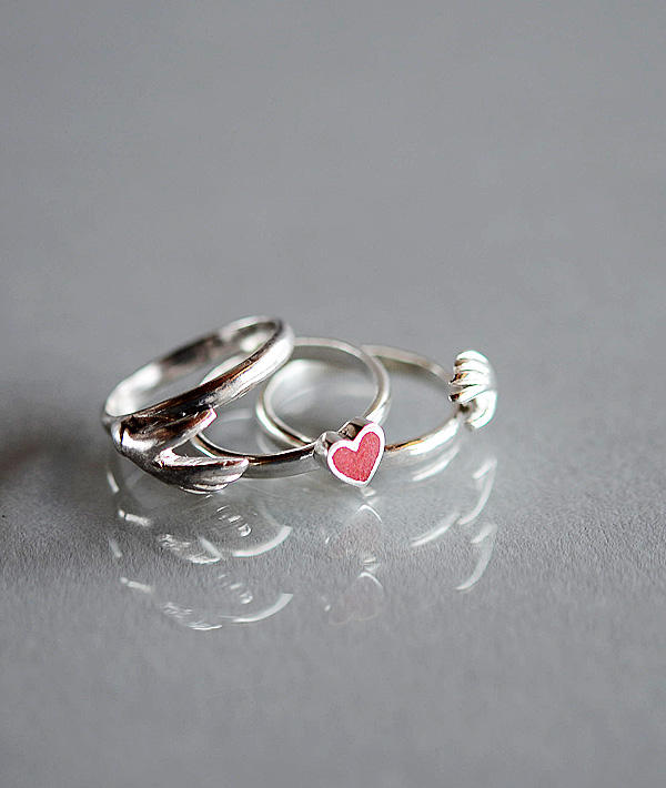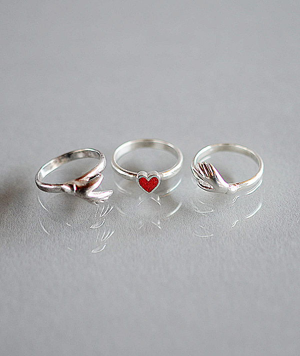 シェイクハンドの中央にハートを挟み込んだ3連リング。
