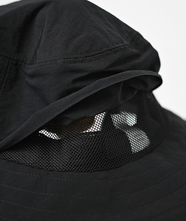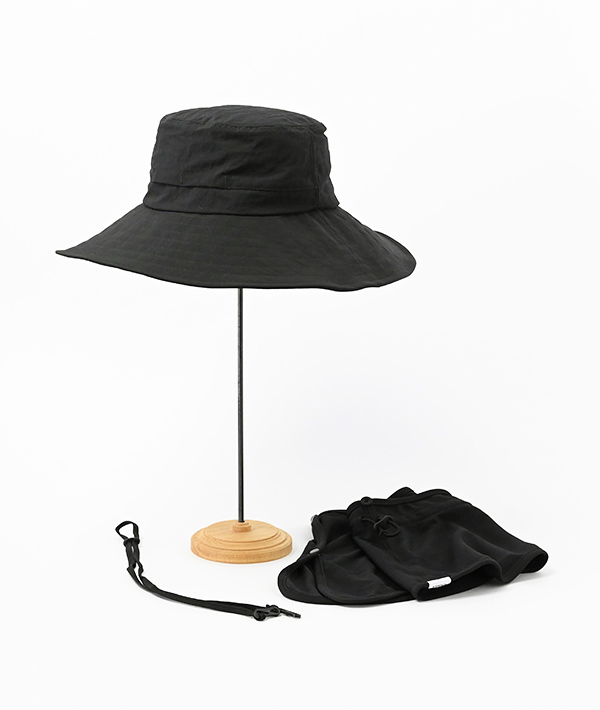 ナイロンのタッサー生地にシワと撥水加工を施した生地のため、ハイテク素材の風合いもありながらカジュアルにお使いいただ けます。風で飛ばないように首の部分にループが付属しています。ベンチレーションがあり、通気性のある構造になっています。取り外し可能な Face guard は、紫外線カット率90%・吸水速乾性・抗ピリング性に優れた生地を使用。Face guard の後部のドローコードでサイズ調整ができ、幅広い用途でお使いいただけます。あご紐、Face guard ともに取り外し可能です