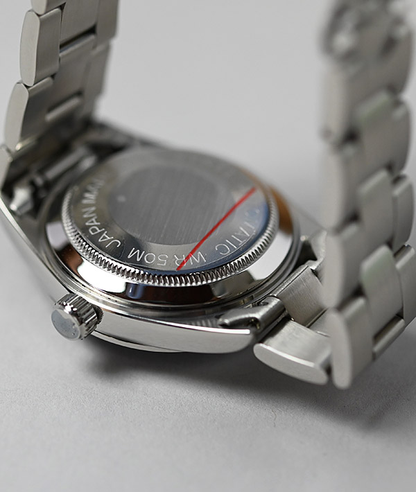 日本製自動巻きムーブメントを搭載した本体ケースは34mmのボーイズサイズ。大きすぎないサイズ感は多くの方の腕に具合よく納まります。アンティークウォッチに多く見られるミラー仕上げの文字盤はシンプルで視認性の良いBLACKカラーです。