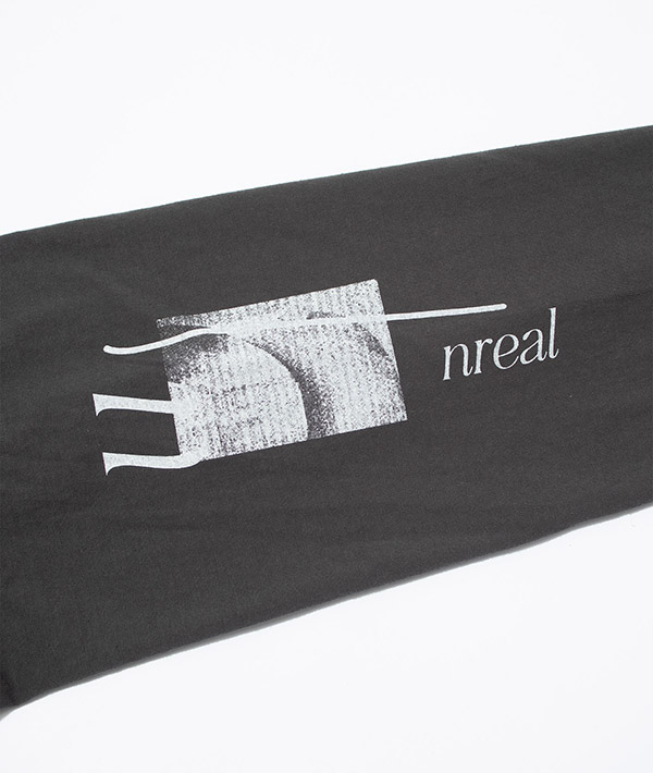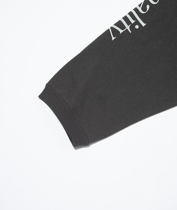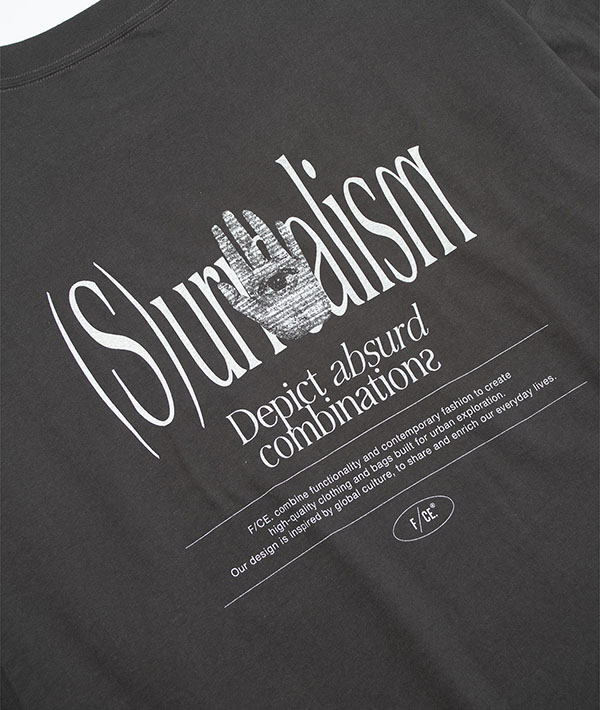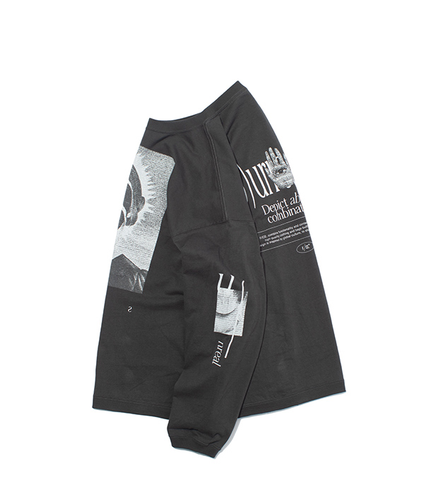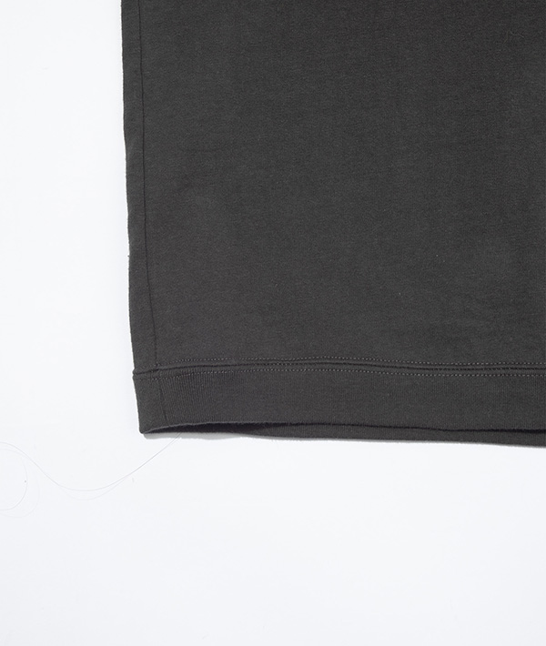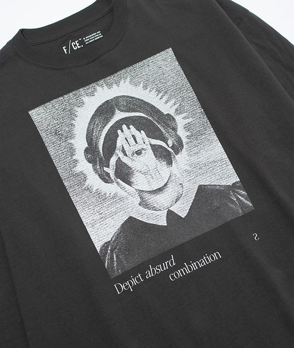 榎本氏の作品のアーカイブから、今期のテーマに合った作品を選び、さらにF/CE.らしいグラフィックとテキストをプラスしたオリジナルデザイン。毒々しいイラストが今回のテーマともリンクし、コレクションの要にもなっています。プリントの上から更に加工を施すことでヴィンテージのバンドTのような雰囲気に仕上げています。リサイクルコットンの使用により、通常の綿糸と違い色々な繊維長があり、不均一であることから節感のある生地になり、ヴィンテージライクな仕上がりとなっています。