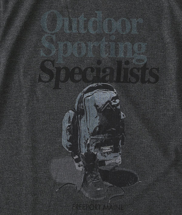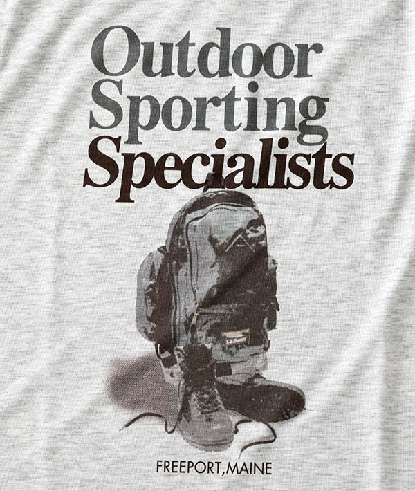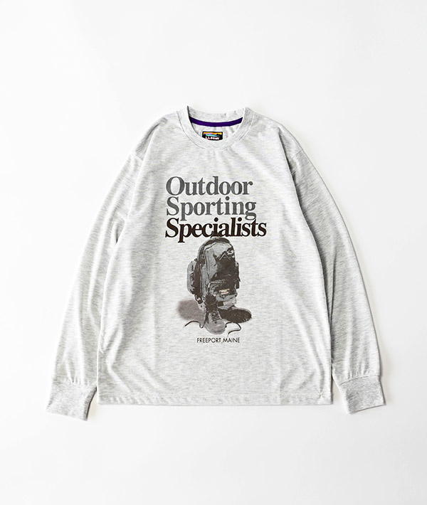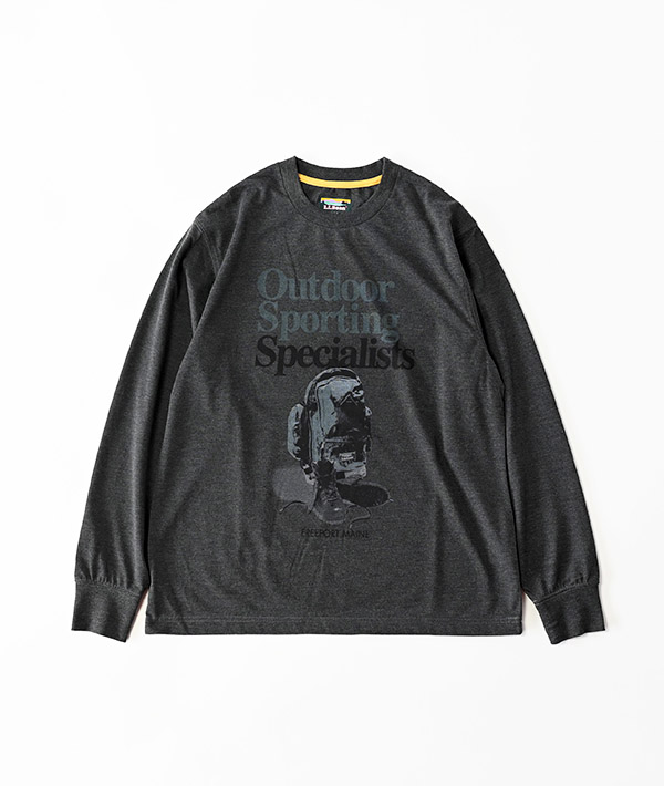 L.L.Bean JAPAN EDITION. フロントにエルエルビーンアーカイブのマウント・カタディン・パックとクレスタ・ハイカーのグラフィック、Outdoor Sporting SpecialistsとFREEPORT, MAINEのロゴ・プリントを大胆にあしらった長袖Tシャツ。素材には、糸の断面を六角形にすることで吸水速乾性や色褪せしにくさが長く続き、ポリエステル100%ながらコットンのようなマットな風合いを持つ機能性ジャージーを採用し、快適さとデザイン性を兼ね備えた一枚に仕上げています。