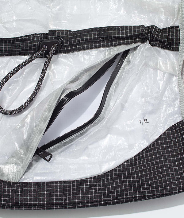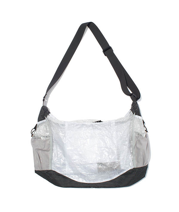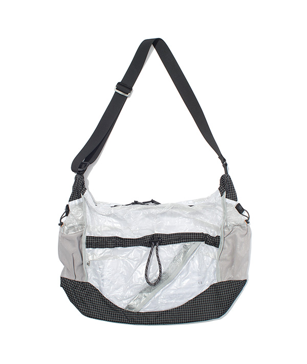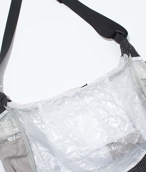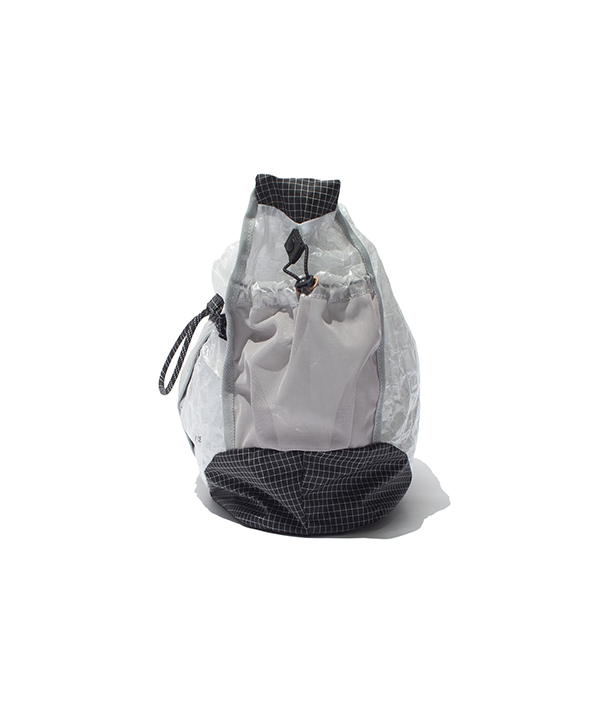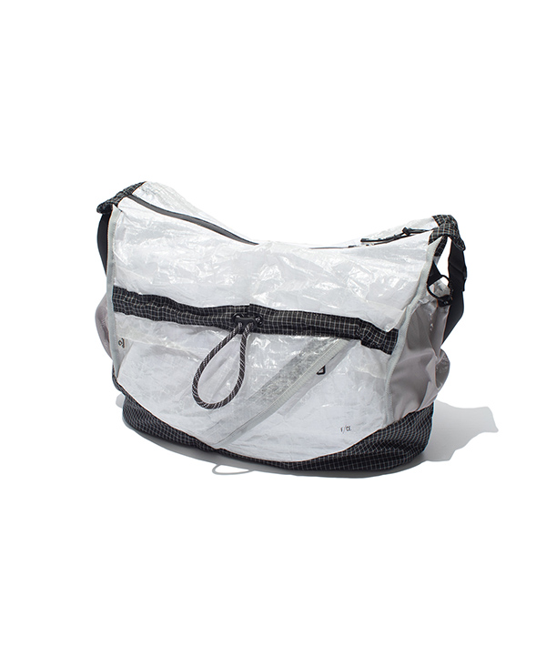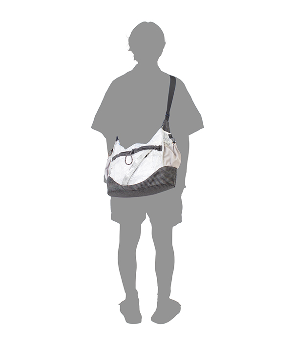 フロントのドローコードでシルエットの調整が可能な2Wayでの使用が可能なショルダーバックをDyneema素材で製作。両サイドには、ストレッチメッシュポケット。シートベルトウエビングテープを採用。