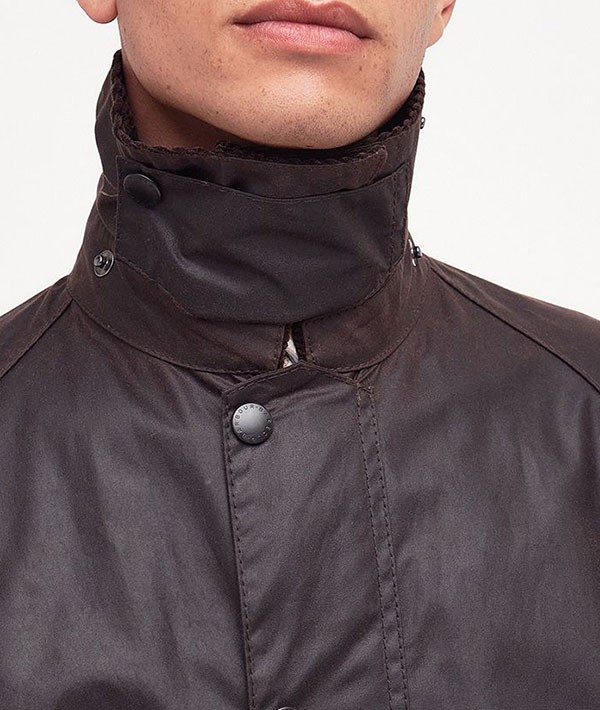 もともと乗馬用ジャケットとして生み出され、優雅なライディングポーズを崩さない着丈の長さやスナップボタン仕様のサイドベンツは裾周りを美しく保つことができるデザインです。当時の実用的なディティールが、今ではデザインアクセントとして生かされています。フロントはダブルジップ仕様で、上側の引き手がリング状になっているのは、手袋をしたままでもジップの開け閉めを可能にするためです。肩を動かしやすいラグランスリーブや、風の侵入を防ぐ袖口のリブなど機能性にもこだわっています。さらに伝統的デザインであるコーデュロイの衿はスナップボタン付きチンストラップを備えており、衿を立てた時もしっかりホールドし、首回りを暖かく保つことができます。裏地にはバブアーの伝統の証であるハウスタータンチェックをあしらっています。