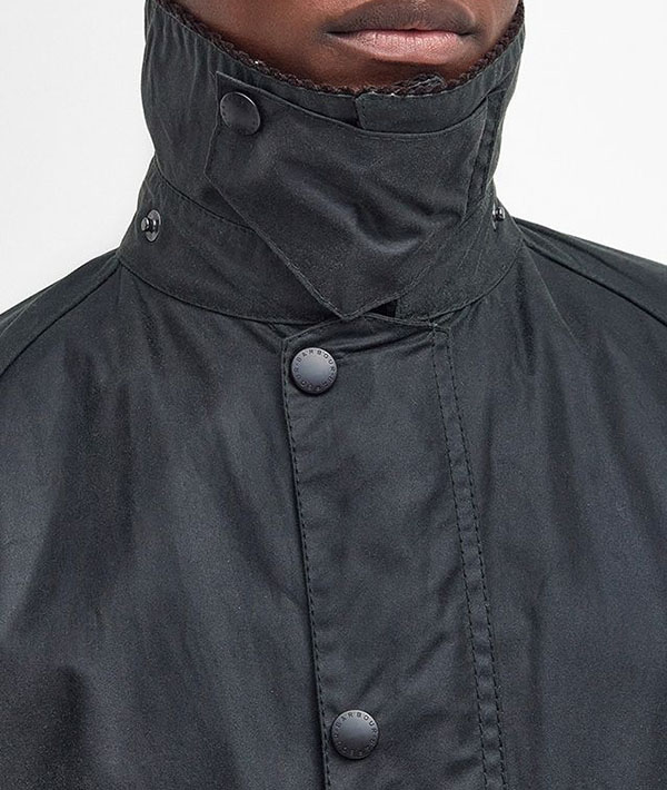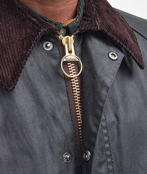 もともと乗馬用ジャケットとして生み出され、優雅なライディングポーズを崩さない着丈の長さやスナップボタン仕様のサイドベンツは裾周りを美しく保つことができるデザインです。当時の実用的なディティールが、今ではデザインアクセントとして生かされています。フロントはダブルジップ仕様で、上側の引き手がリング状になっているのは、手袋をしたままでもジップの開け閉めを可能にするためです。肩を動かしやすいラグランスリーブや、風の侵入を防ぐ袖口のリブなど機能性にもこだわっています。さらに伝統的デザインであるコーデュロイの衿はスナップボタン付きチンストラップを備えており、衿を立てた時もしっかりホールドし、首回りを暖かく保つことができます。裏地にはバブアーの伝統の証であるハウスタータンチェックをあしらっています。