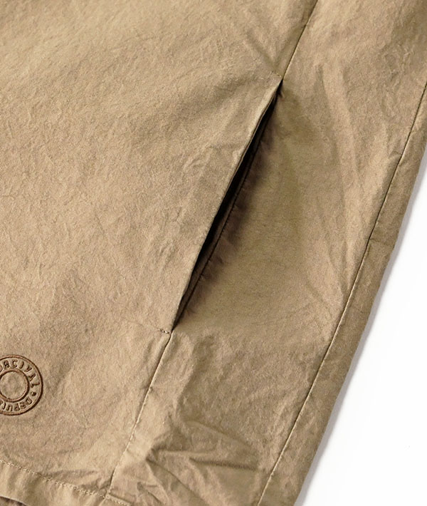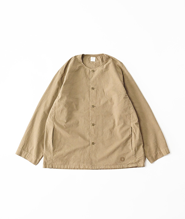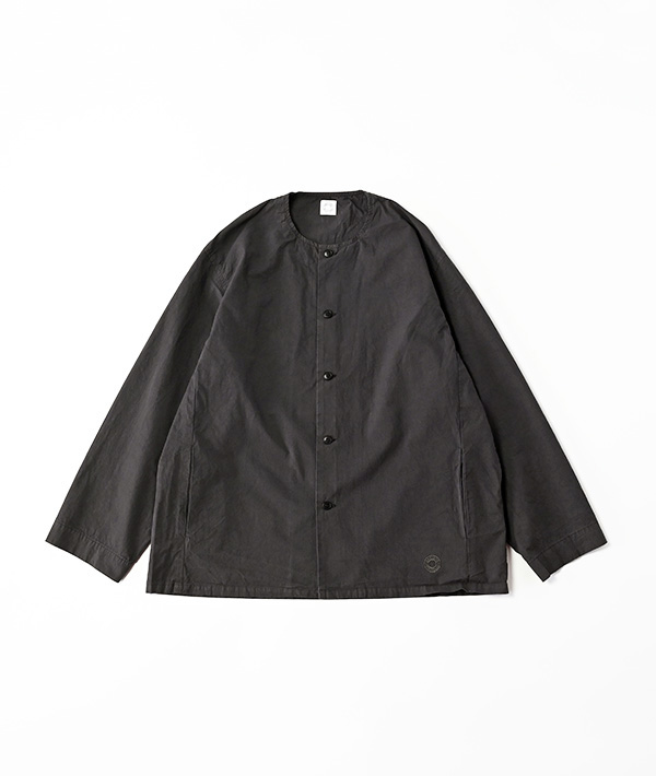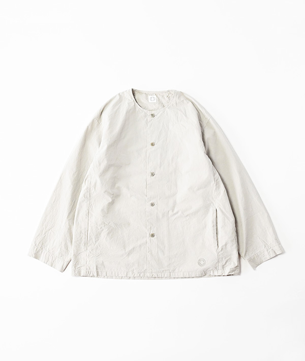製品染めを施し洗い晒しのまま仕上げた、ノーカラーのシャツブルゾン。サイドにはスリットポケットが備わっています。ナチュラルなシボ感が特徴的な生地は、一部強撚糸を使用した40番手のポプリン素材に近江晒(おうみさらし)加工を施したのちに製品染めしています。製品染めならではのパッカリング感も特徴。ユニセックスでご利用いただけます。