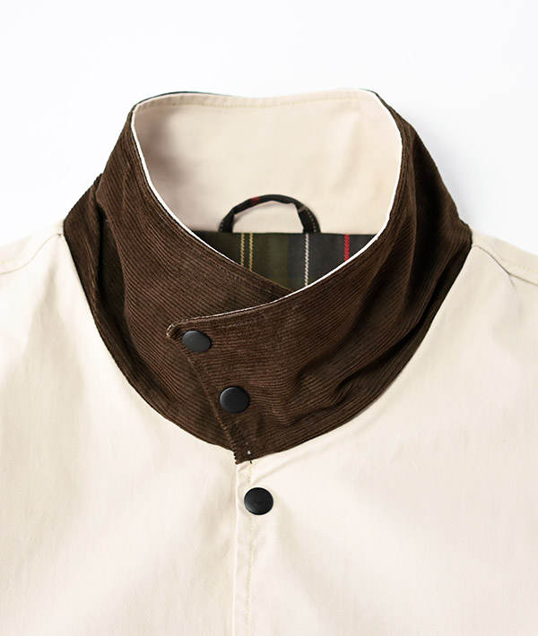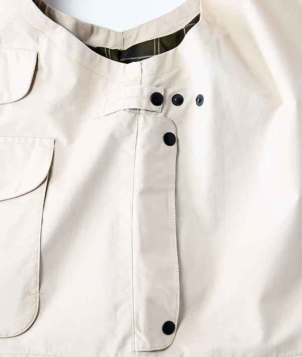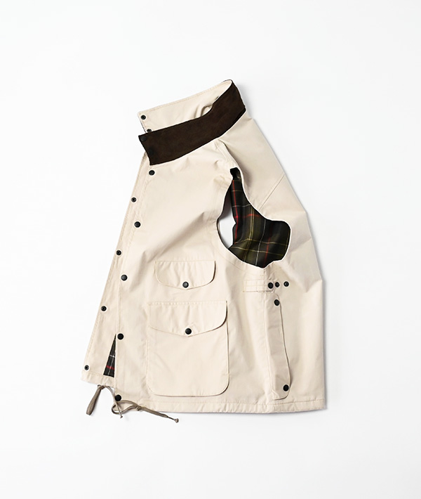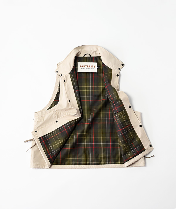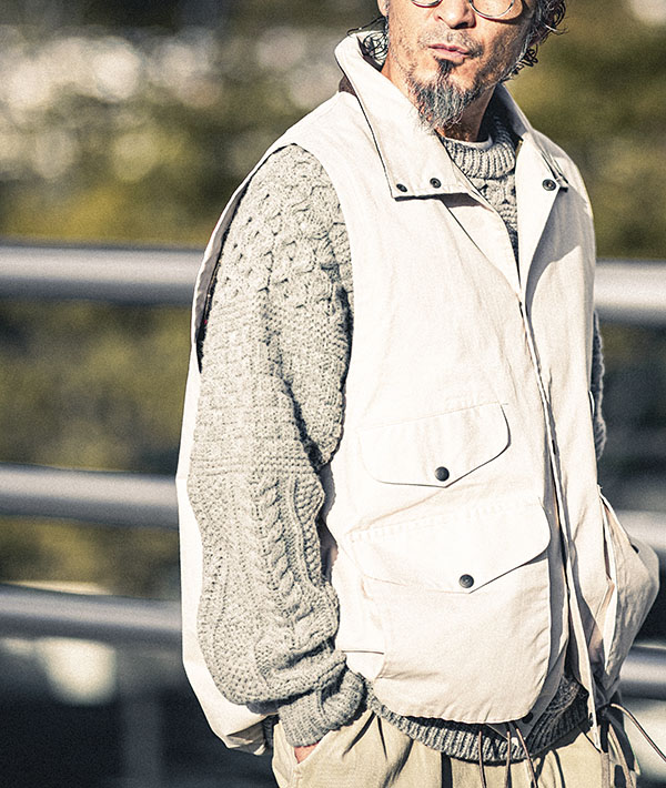 トラディショナルなハンティングウエアを思わせるデザインのベストです。フロントには大きさの異なる4つのフラップポケット。背面にはハンティングベストならではのデザインである、ゲームポケットが配置されています。襟裏はコーデュロイの生地になっており、襟を立てて着る際のアクセントとなっています。