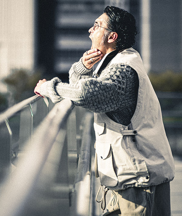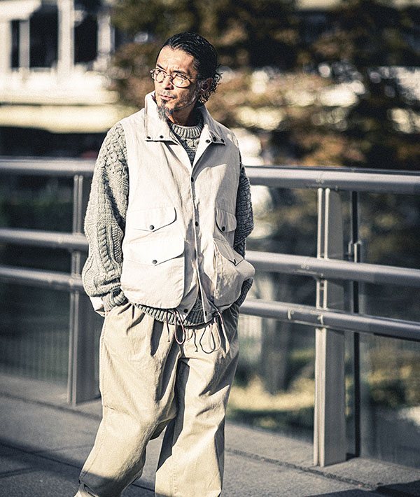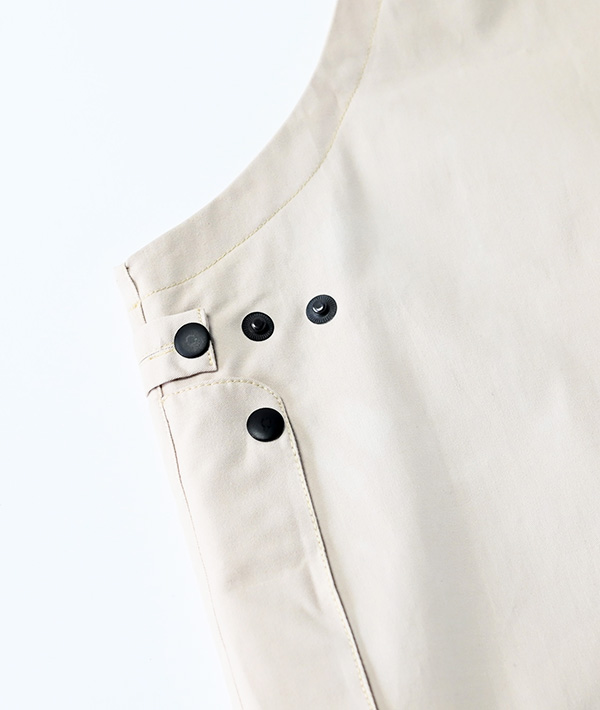 身幅が広くゆったりとしたオーバーサイズベストなので、コートやジャケットの上にレイヤードしていただくスタイルをおすすめしています。ボリュームのあるニットやスウエットとも相性が良いので様々なスタイリングを楽しんでいただけます。脇部分にはスナップボタンのアジャスター、裾にはドローコードが配されシルエットに変化をつけることもできます。