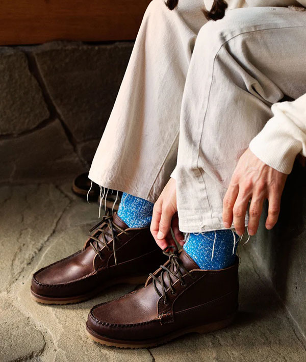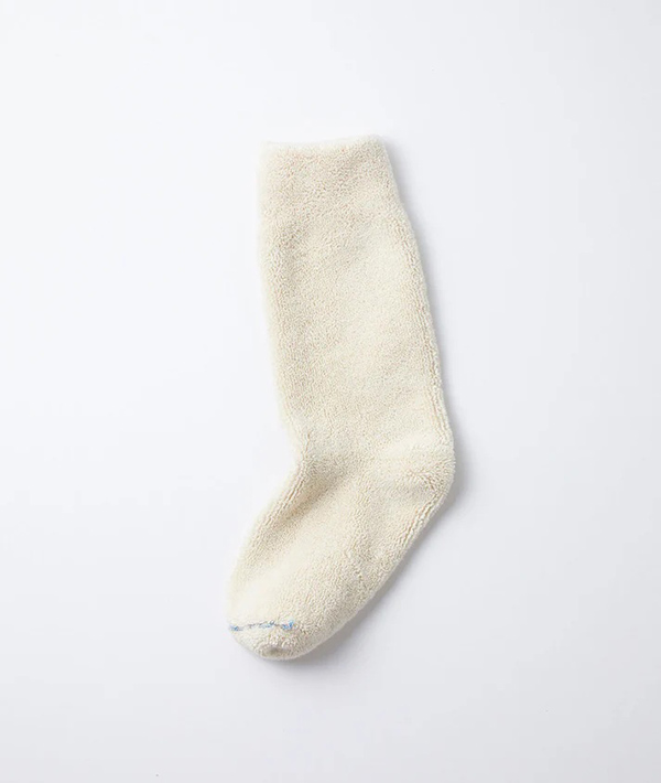 登山用ソックスから着想を得たダブルフェイス仕様のソックスは、ブランドスタート時より展開するROTOTOのスタンダードアイテム。外側にはメリノウール、内側には未染色の太番手のオーガニックコットンを使用し、スウェットシャツのような肉感を表現。また、内側のオーガニックコットンをループ状に編み立てることで、肌あたりの優しいふっくらとした風合いに仕上げています。