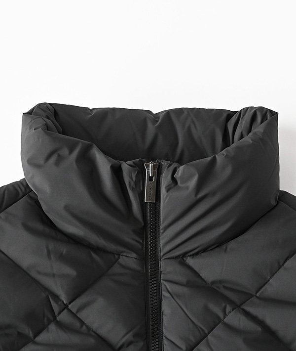 クラシックなダイヤモンドキルトを施したショートジャケット「アデル」。光沢を抑えたソフトな素材を使用し、リラックス感のある着心地に仕上げました。ドロップショルダーと丸みのある裾が柔らかなシルエットを演出。ゆったりとした身幅で重ね着も快適です。スタンドカラーにはたっぷりのダウンを充填し、首元までしっかり暖かく、フロントポケットにはフリースライニング付きで、手先もあたたかく保ちます。