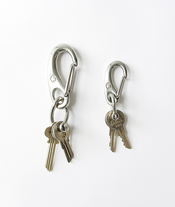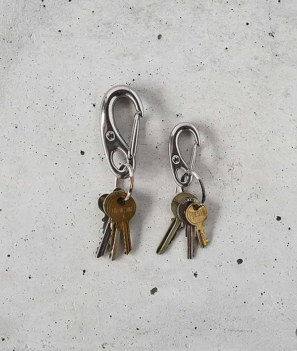 プロのヨットマンたちが実際にロープを固定させるために使用しているWichard社製カラビナ。別売りのシャックルや付属のダブルリングを合わせて使用することで増えてしまいがちな鍵をすっきりとまとめてキーリングとしてお使いいただけます。耐久性、機能性に優れているのはもちろん、スプリングが強くベルトフープやバッグから脱け落ちる心配もなし。