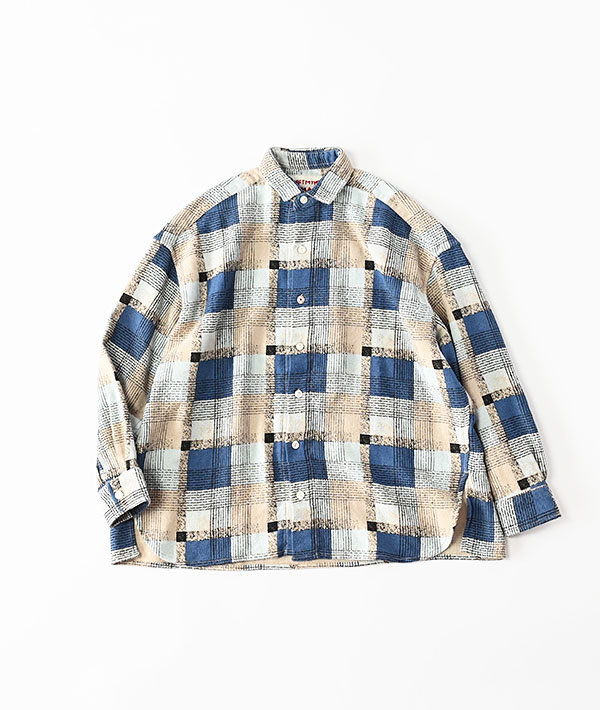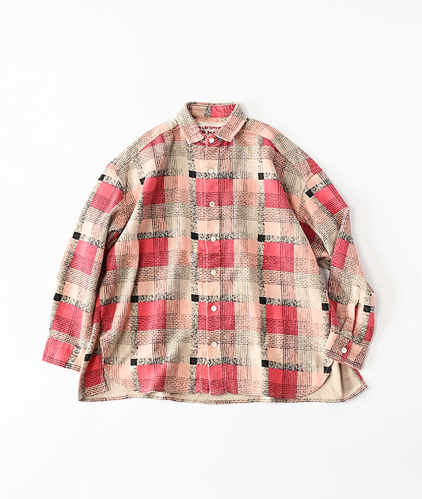 60年代のヴィンテージプリントネルを参考に、インドで織り・プリント・加工を施したプリントネルチェック。インドならではの粗野さと柔らかさを併せ持つ風合いが特徴で、着込むほどに表情が増していく生地感です。ウィメンズらしいミニマルなデザインのシャツで、コンパクトな襟がすっきりとした印象を与えます。貝ボタンに加え、さりげなく配したオリジナル刻印のメタルボタンがアクセント。身幅には程よいゆとりを持たせつつ、着丈のバランスを調整することで、だらしなく見えないリラックスフィットに仕上げています。