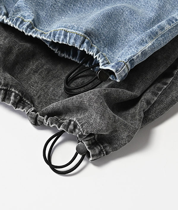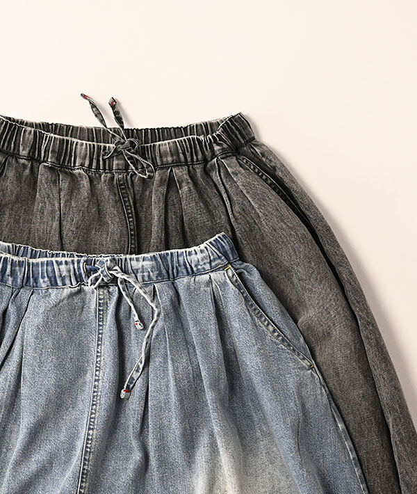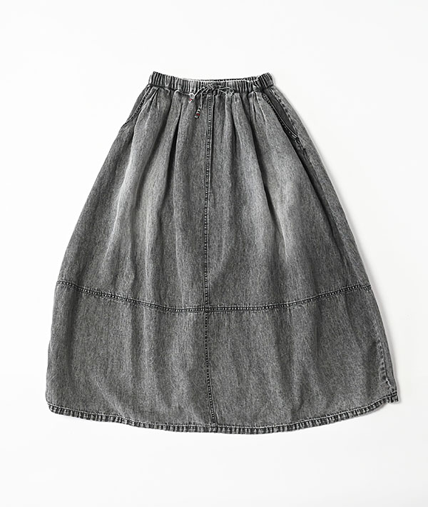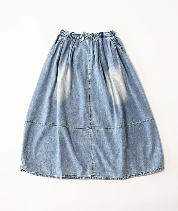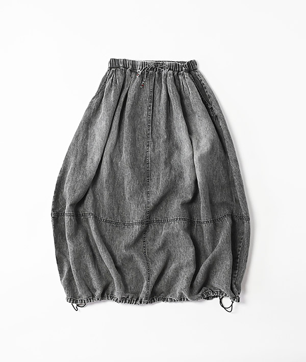 裾に施したドローコードを絞ることで、特徴的なバルーンシルエットを表現したスカート。インドで織った柔らかな風合いのデニムを使用し、たっぷりとしたオーバーフィットながら、裾をギャザリングすることでシルエットの変化をお楽しみいただけます。