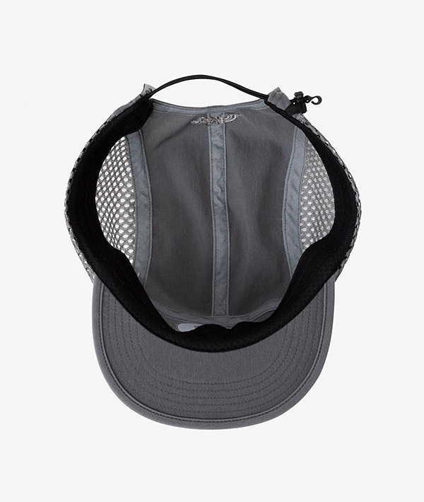 ヴィンテージ風の色落ち感を再現したナイロン100%の5パネルキャップ。コットンライクで適度な厚みと耐久性を備え、サイドメッシュで通気性を確保。フロントと後頭部に刺繍を配し、ドローコードでサイズ調整可能なフラットバイザー仕様の実用的なデザイン。