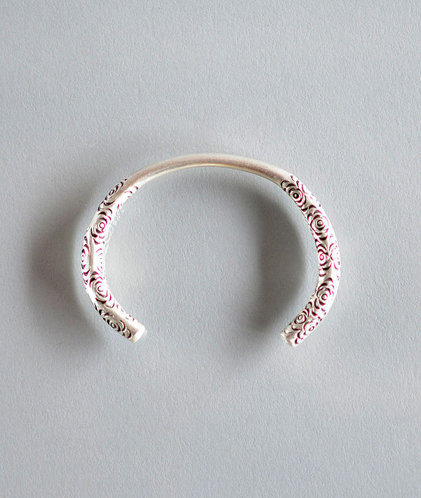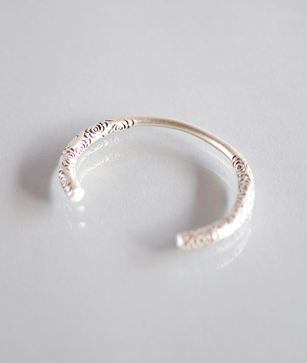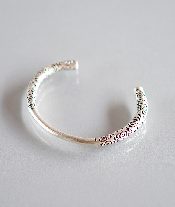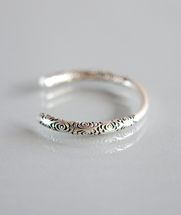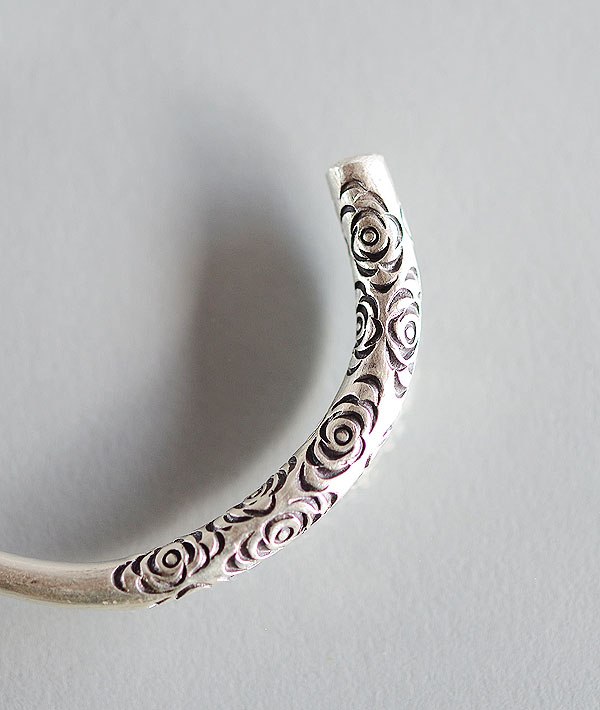 自然と共存するカレン族は、「アニミズム」の精神を持ち、全てのものには命が宿ると考え、彼らの創作のモチーフには身近に暮らす動物や植物または生活に要する道具などを象ったものが数多くあり、刻印には様々な意味合いや願いが込められています。純度の高いシルバーとフォークロアなデザインが相まって独特な美意識を醸し出すシルバージュエリーです。