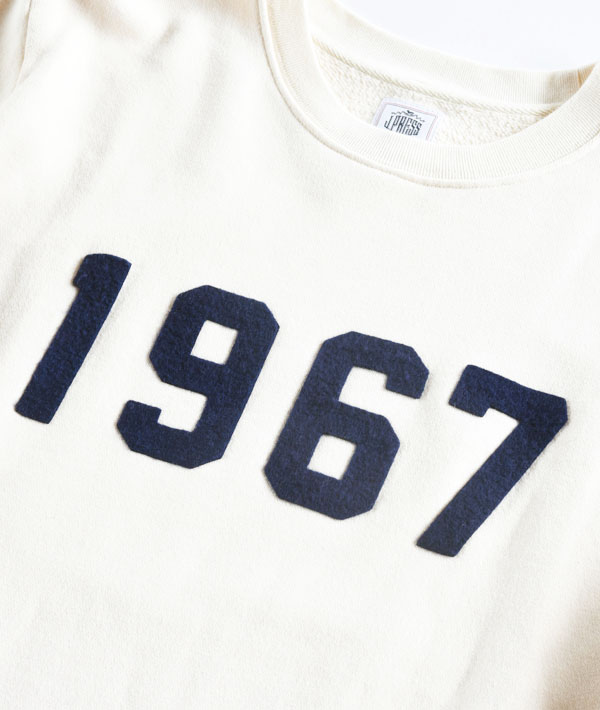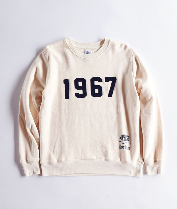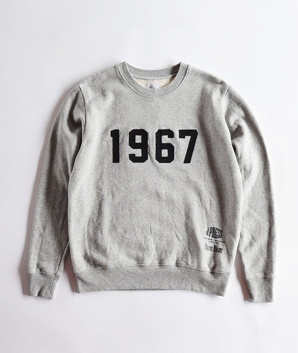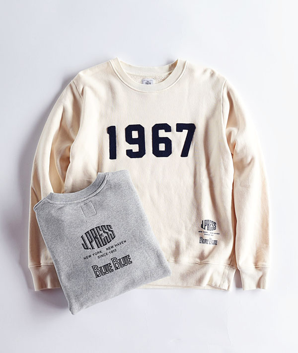 1960年代のアイビーリーガー達が、カレッジで着用していたスウェットシャツをイメージした一枚。フロントにはコレクションの基軸となる“1967”のフェルトワッペン、背面にはBLUE BLUE×J.PRESSのコラボレーションロゴを施しています。
