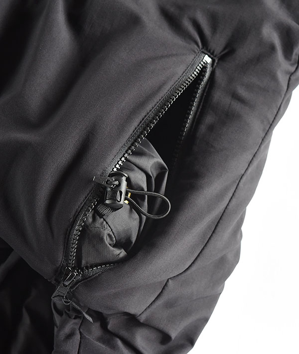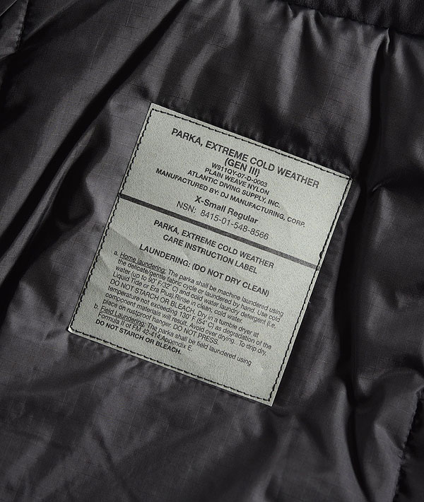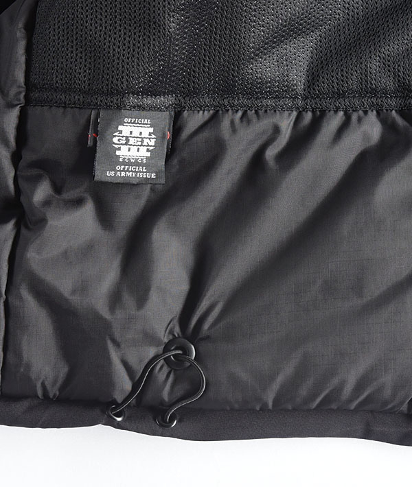 ECWCSとは「Extended Cold Weather Clothing System」の略で、米陸軍が1980年代に開発した拡張式寒冷地被服システムです。気候条件によって7種類のトップスと5種類のボトムから構成されたレイヤード(重ね着)を変えることによって様々な地域に対応できるように開発された近代ミリタリーのレイヤリングシステムです。こちらのBLACK LEVEL7 HAPPY PARKAは、シカゴ警察に納入されているモデルであり、いわゆるGI物(軍官給品)には存在しないALL BLACKカラーが希少性高く、US ARMYとは異なる背景も魅力のアイテムです。過酷な環境下での使用を想定して作られたアイテムのため、防寒・保温・耐水性はもちろんのこと、フードは内側にしまうことができ、またポケット内のドローコードより着丈を調節することも可能です。細部まで工夫の詰まったデザインも注目です。