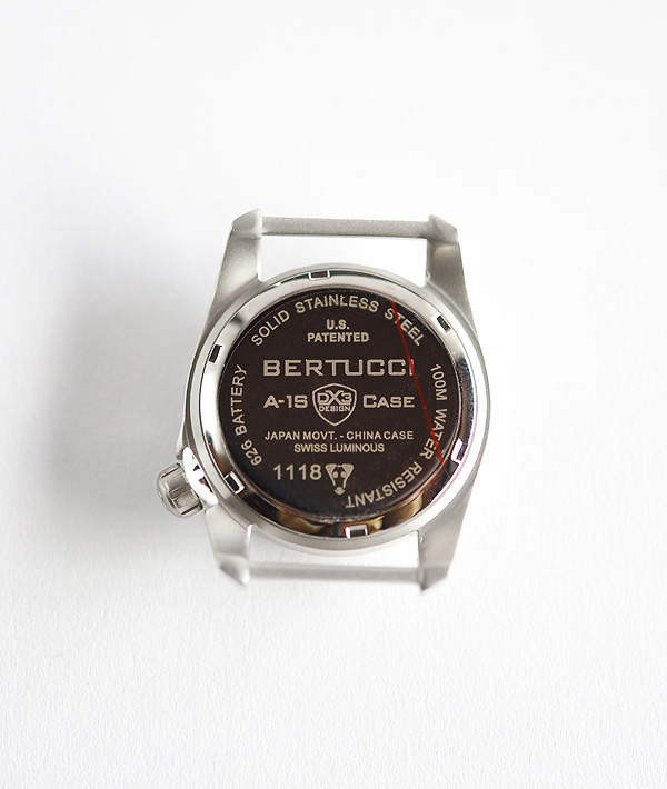 アメリカの特許を取得したDX3デザインケースはBERTUCCIの耐久性とデザインの美しさに対する考えが凝縮されたものです。特殊加工をした強靭なナイロン製ベルトを時計ケースと一体化したバーに通す構造にすることで、シンプルで美しいデザインに加え、横への引っ張りや捻じれに対しての耐性の大きな向上が実現されています。また、ムーブメントを水や微細な異物から守る為に裏蓋には高い気密性と防水性を備えたねじ込み式の裏蓋(スクリューバック)を採用。