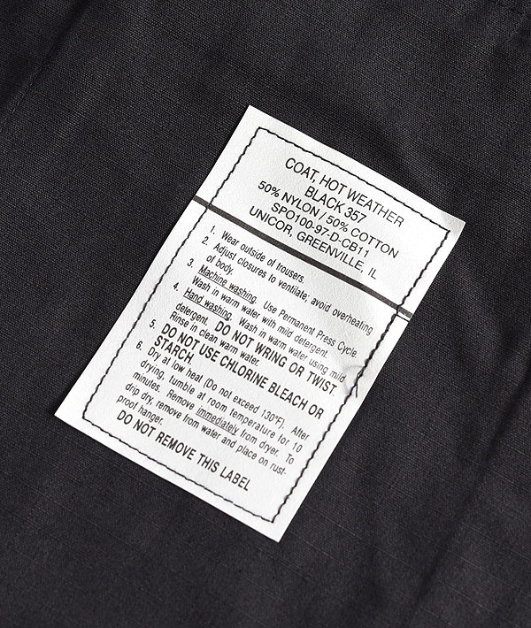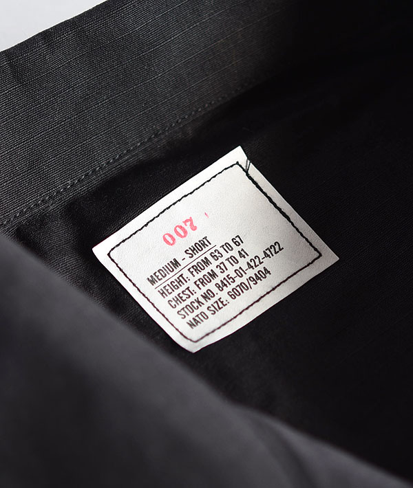 1997年の僅か1年間だけ製造されたブラックのBDUシャツ。ポケット裏に付けられたミルスペックの色別記載の「BLACK 357」がアメリカ軍正式官給品の証です。一般流通している民間品のブラックのBDUシャツとは異なり、正式に軍の特殊部隊や通称OPFOR(対抗部隊)と呼ばれる、軍事演習の際に仮装敵軍として演じるための部隊に使用されていたリアルサープラス。グッドコンディションです。