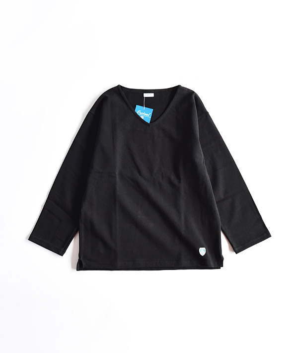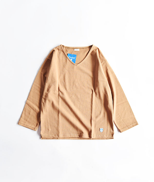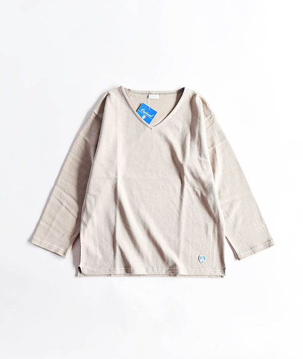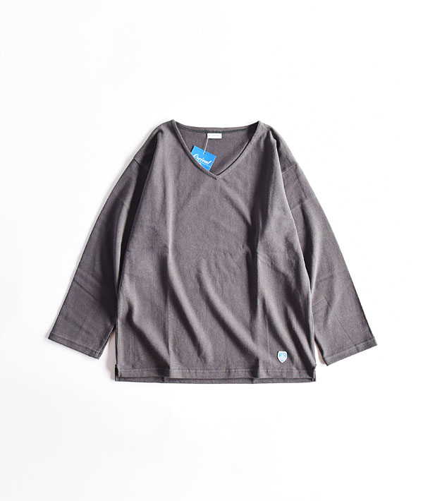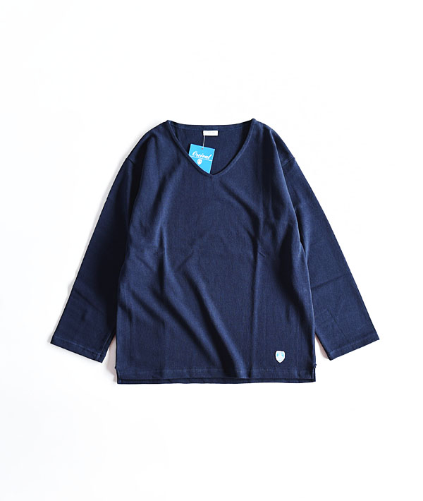 ORCIVALの代表的な素材の一つ、コットンロードのVネックカットソーです。ドロップショルダーでありながらルーズ過ぎない、品のよい仕上りです。素材に用いる、空紡糸(オープンエンドヤーン)で編まれたコットンロード生地は、着込んでいくほどに風合いが増す軽くて丈夫な素材です。