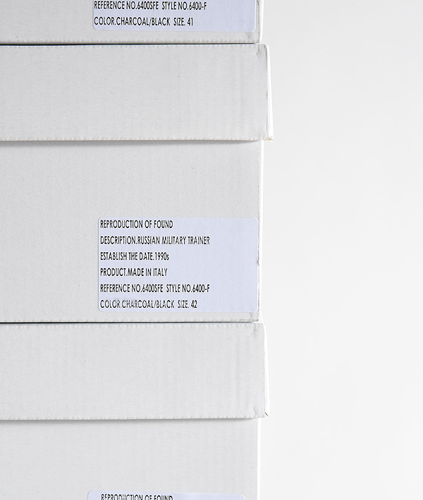 見つけ出す:FOUND、再現する:REPRODUCTIONをコンセプトに2016SSよりスタートしたシューズブランド。ミリタリートレーナーシリーズは1950年代~1990年代にかけて数多くの軍用トレーニングシューズを生産していた各国のファクトリーで、ひとつひとつ丁寧にハンドメイドで生産されています。ロゴやタグには品名、国名、年代を記載しデザインソースを明かしています。ミリタリーアイテムを中心に時代を超えた普遍的なアイテムを見つけ出し、現代的に再現させてリリースしています。
