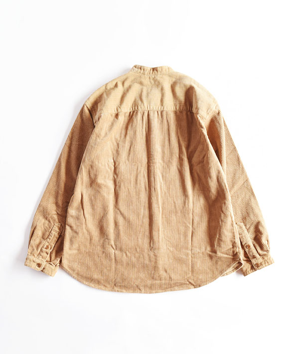 しっかりとした生地感のコーデュロイ素材を使用したスタンドカラーシャツ。ゆったりとしたワイドシルエットながら着丈をやや短めに仕上げることでスタイリングのバランスを取りやすく、シャツジャケットとしても、様々なレイヤードスタイルを楽しめる汎用性の高い1着です。同じ生地を使用した「コーデュロイ ウォーカーパンツ」とセットアップでの着用もおすすめです。