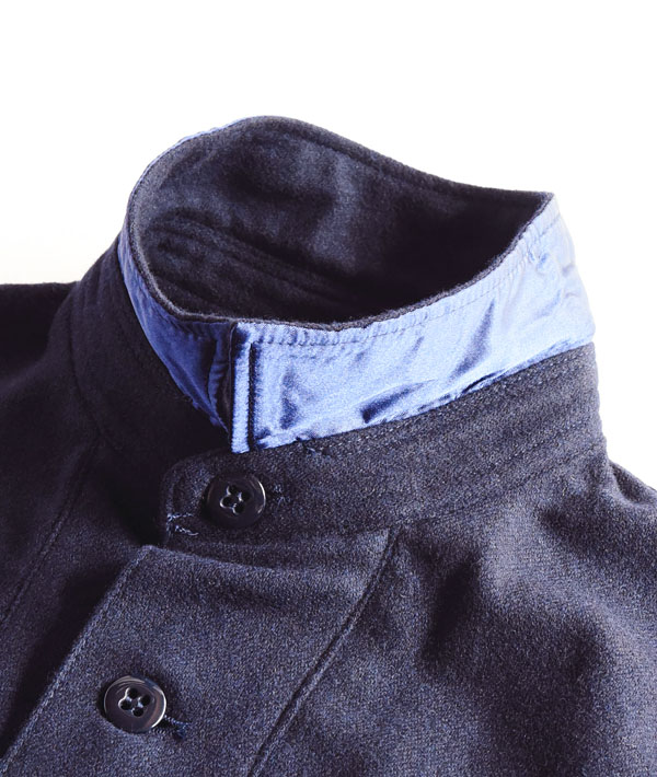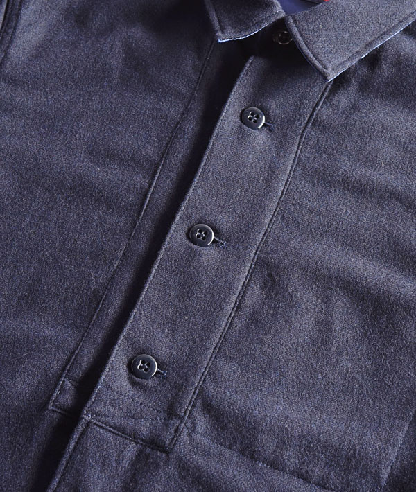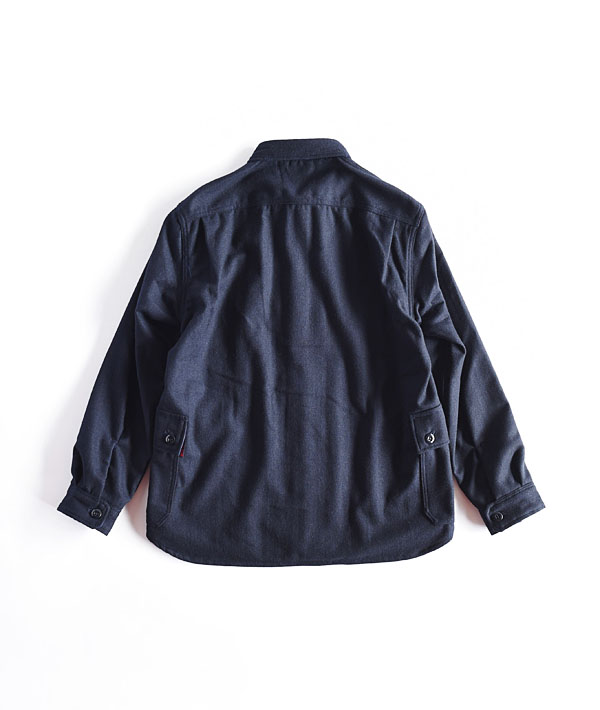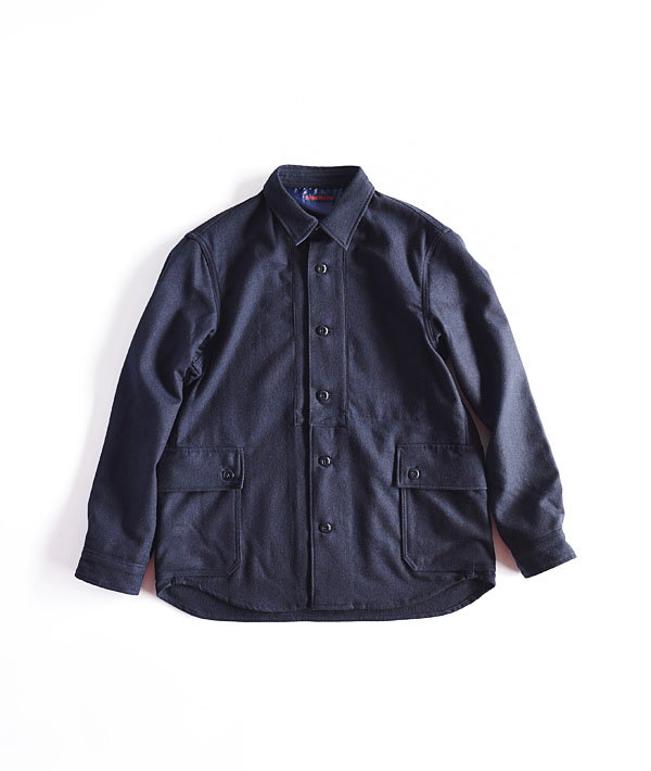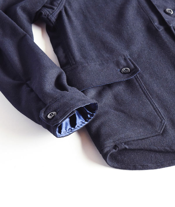 柔らかな肌触りのウールナイロンフラノ素材を使用したシャツジャケットです。CPOシャツをベースに、さらにミリタリー感を演出したサイドのフラップポケットが特徴。裏地には滑りが良くきれいな発色のフレンチブルーを合わせています。軽く羽織った時や袖口からちらりと現れ、スタイリングにアクセントを与えてくれます。上品な生地感と色合いも魅力的で、ラフな着こなしからキレイ目なスタイルまで合わせやすい1着です。