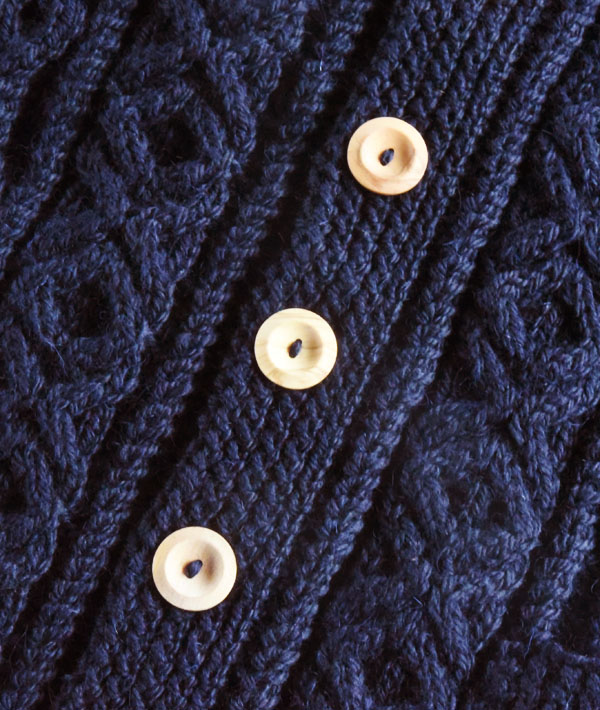 インバーアランの中で最も代表的なケーブル編みで作られた「3Aランバーカーディガン」。フロントにウッドボタンと左右にフロントポケットを備え、アウターとして使い勝手のよいニットカーディガンです。英国内で紡績された最上級グレードのアラン糸をハンドニット用に太く撚り、しっかり目を詰めて編み上げられています。ハンドニットならではの、熟練ニッターによる立体感と重厚感のあるケーブル編みを最大に楽しめます。