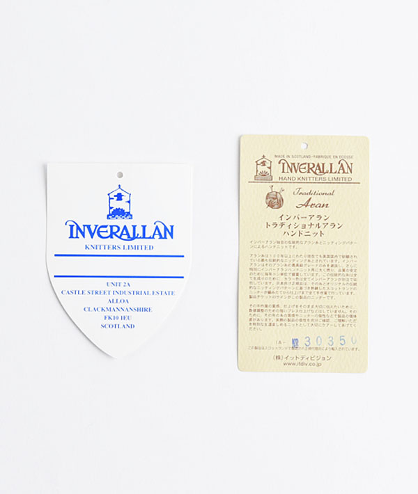 インバーアラン自体は、そもそも、スコットランドのマスプロダクトでは出来ない、アラン諸島に独自に伝わる伝統的なニッティングパターンによるハンドニット製品を、インバーアランブランドの名のもとに集めることにより始まったものです。これらの製品のほとんどすべてが、ハンドメイドやハンド仕上げになっています。
