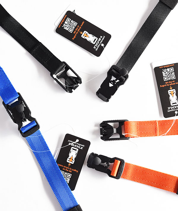 バッグとかベルトの留め具であるバックル。ドイツの老舗メーカー「フィドロック社」のマグネット式バックルを手にした時、誰もが驚く脱着のスマートさ、それでいて軽量で高剛性。装着時はまさに吸い付く。近付けるだけでカチャリと自動的にハマる。外す際もワンアクションで解放される。装着中は決して外れることがない。安全性の証として事故がゆるされないヘルメットや抱っこ紐などにも採用されています。