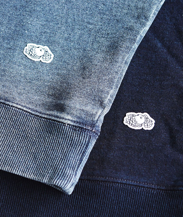 「FRUIT OF THE LOOM」と「BLUE BLILE」のコラボレーションによるインディゴスウェット。インディゴ染めによる深みのある風合いとラグランスリーブの動きやすさが特徴。袖や裾のリブを短めのデザインで仕上げ、小さなフルーツのロゴワッペンをアクセントとして施しています。