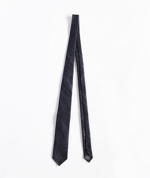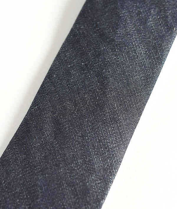 カジュアルなタイドアップスタイルのアクセントとしてお勧めのライトデニムを使用したネクタイ。デニム素材ならではの経年変化も楽しみなアイテムです。