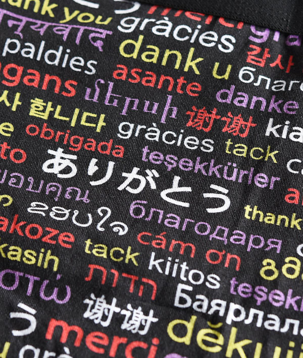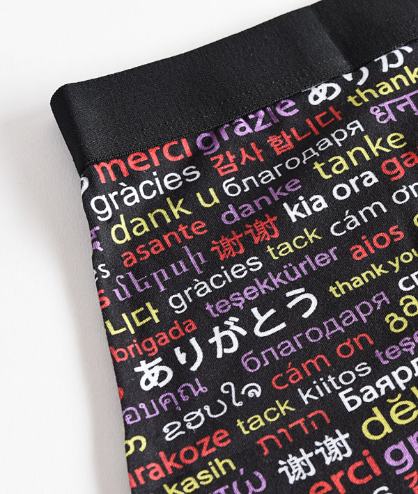 HRM ARIGATOボクサーパンツ。世界各国の「ありがとう」の言葉をプリント。ウエストゴムにH刺繍を施し、立体的なフロントデザインでフィット感が良く、肌ざわりの良い、柔らかいウエストゴムを使用しており、履き心地も快適。専用パッケージ入りでギフトにも最適です。