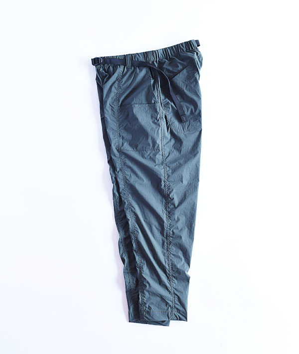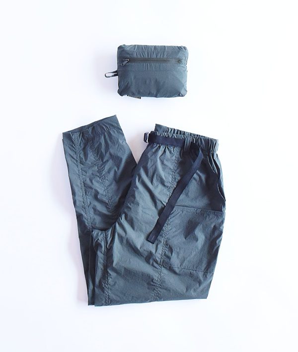 非常に軽くて薄い20デニールのナイロンを使用したハイストレッチ素材のオールウェザーパンツです。強撥水機能があり、夏のあらゆるシーンで活躍します。ウエストはゴムとベルトで調整でき、前後のポケットと左右大腿にもセンターシームを利用した使い勝手の良いポケットが配備されています。ウエスト後ろにパッカブル仕様のファスナー付きポケットがあり、小さく収納出来て急な雨にも対応可能です。タウンユースはもちろん、アウトドアシーンでのアクティブな着こなしにもオススメです。