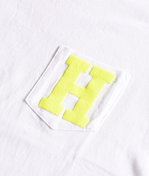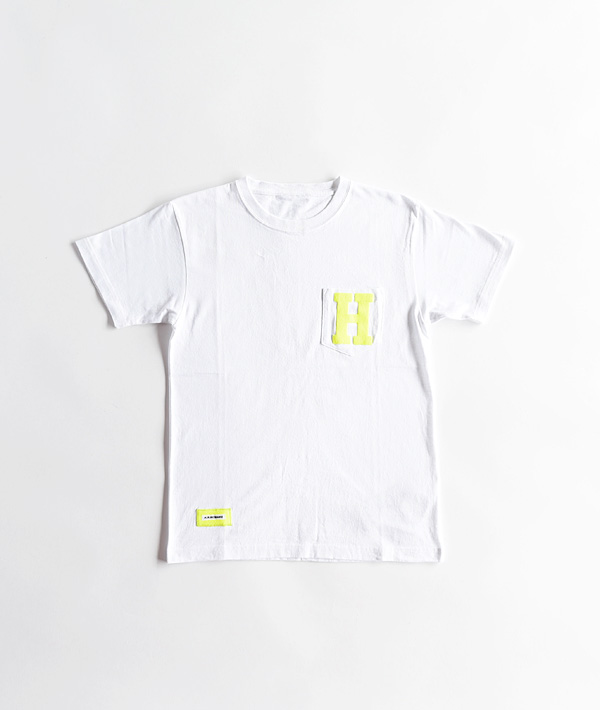 リメイクシリーズの新作ポケットTシャツです。左胸ポケットにHロゴを施したシンプルなデザイン。右裾のブランドタグも程よいアクセントになっています。