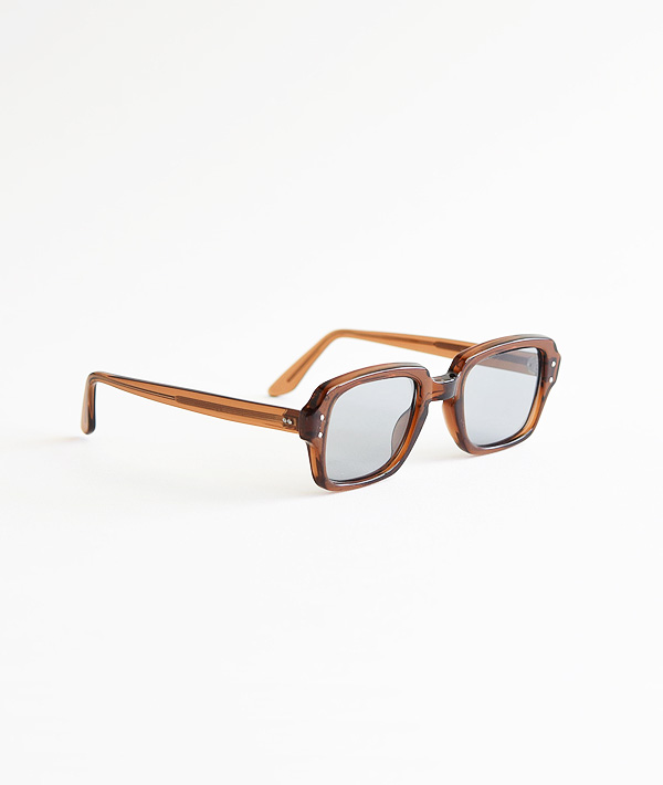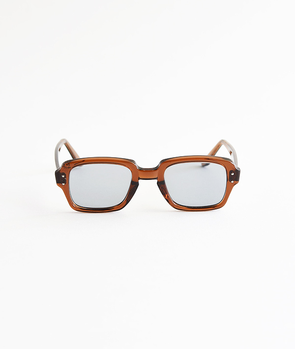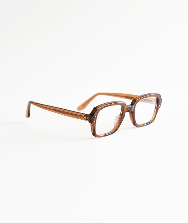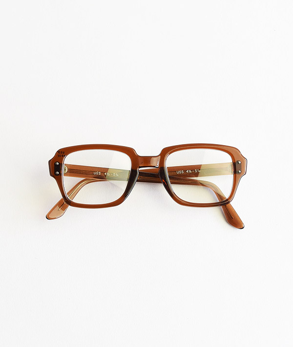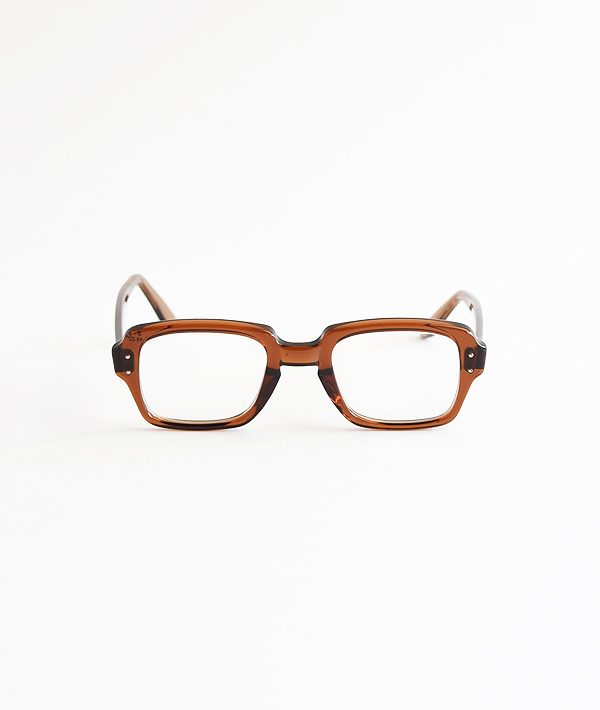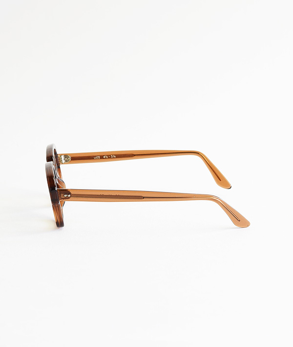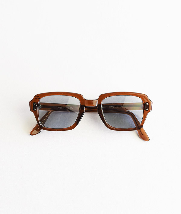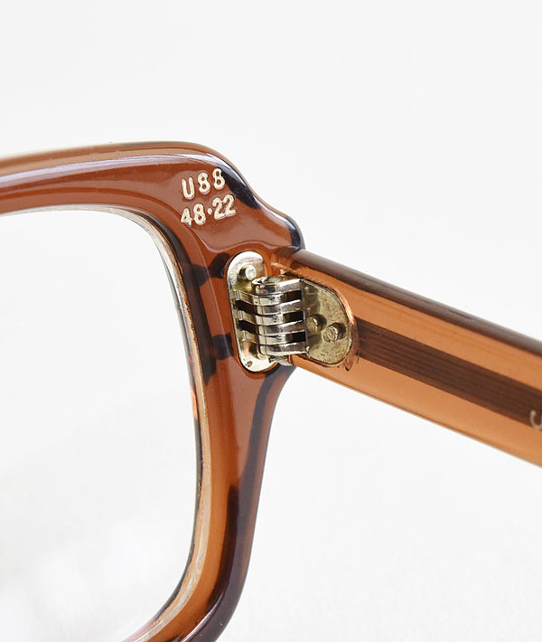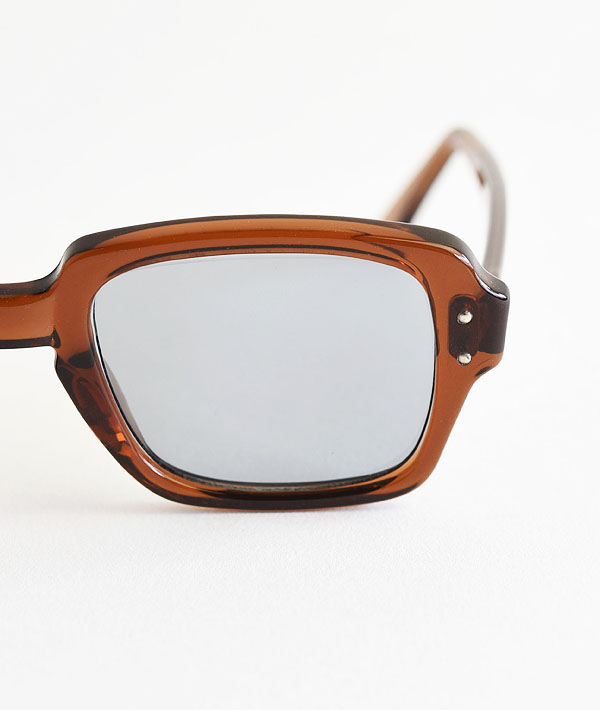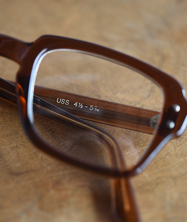 こちらは、1950年代より基本的なフォルムを大きく変えず、頑なに本セルロイドで作られているアメリカ製のトラッドなモデルです。サイズは特に人気のある48で、ディティールは人気の7バレルヒンジ&マイナスネジ仕様になります。この希少なフレームですが30年以上前のデッドストックとなるとどうしてもフレームに歪みが出てきてしまいます。その歪みを一本一本、日本の職人さんに手作業にて調整をしていただきUVカットレンズへと変更を施しています。